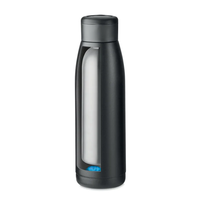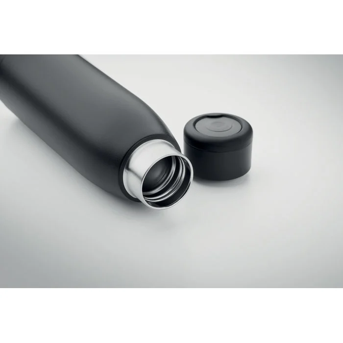 Bouteille à double paroi en acier inox recyclé (90 % d’acier inox recyclé et 10 % d’acier inox) avec couvercle souple en silicone. Agiter la bouteille pour que la température de la surface se réchauffe ou se refroidisse, en fonction du liquide contenu. 400ml. Anti fuite