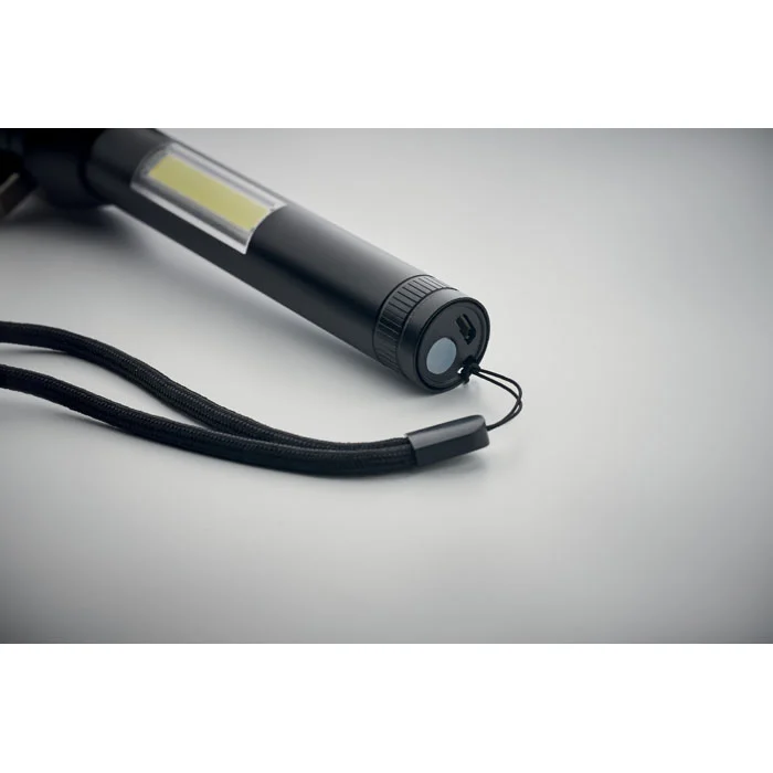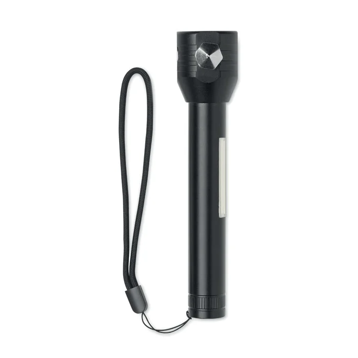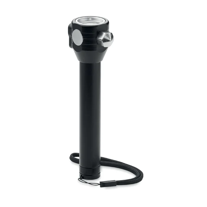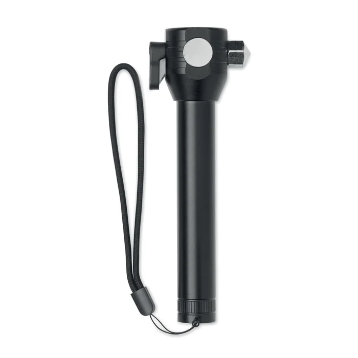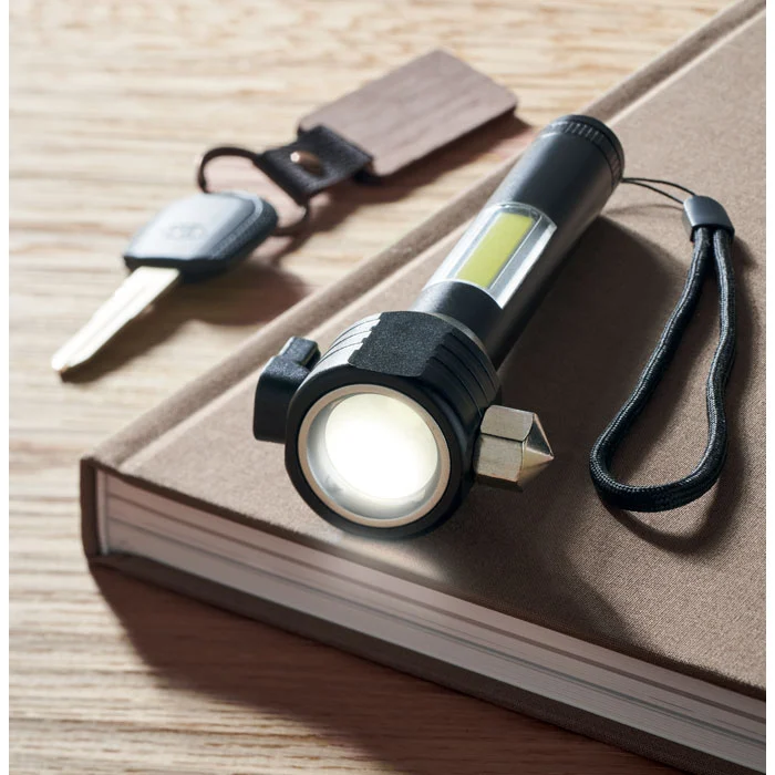 Torche 3 en 1 en aluminium avec marteau d’urgence et coupe-ceinture. Elle est équipée d’une lampe COB sur le côté et à l’avant. Aimant et dragonne inclus. Batterie rechargeable intégrée de 500mAh incluse.
