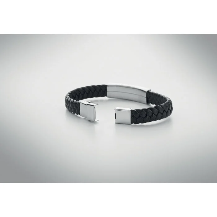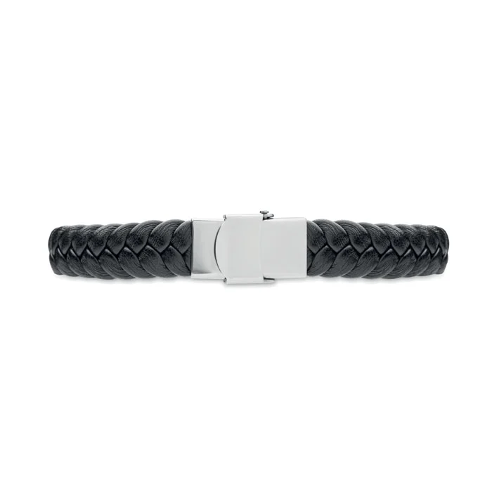 Bracelet en simili-cuir tressé, avec des accessoires en acier poli. Fermoir à pression. Tour de poignet : 21 cm.