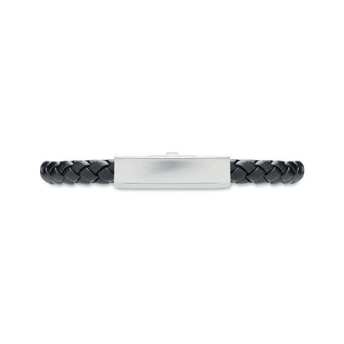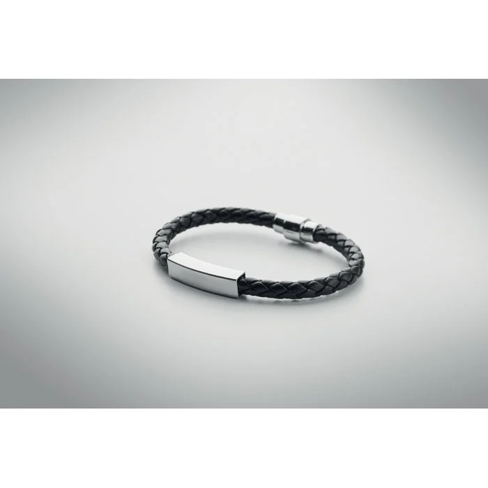 Bracelet en simili-cuir tressé, avec des accessoires en acier poli. Fermoir à pression. Tour de poignet : 18 cm.