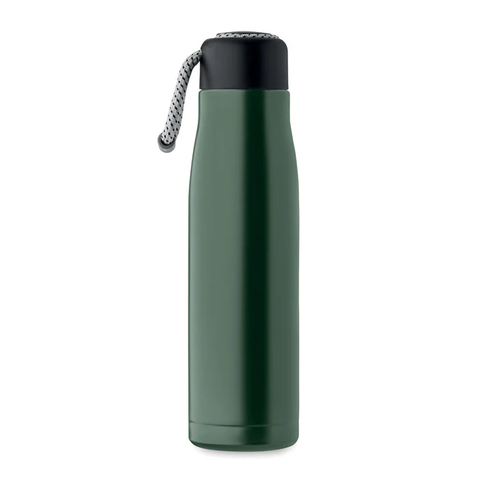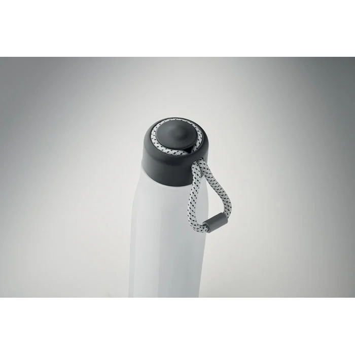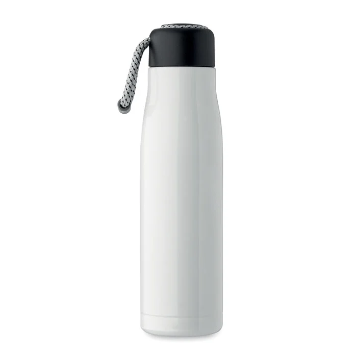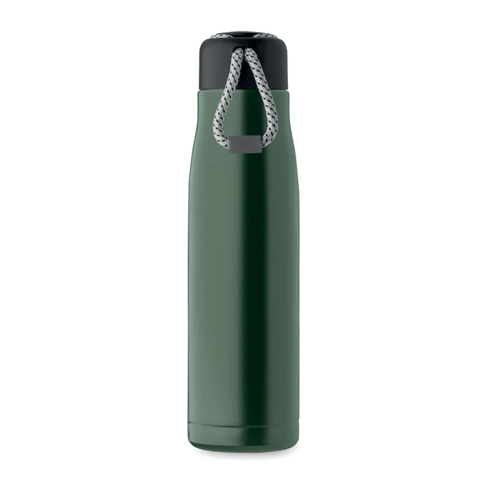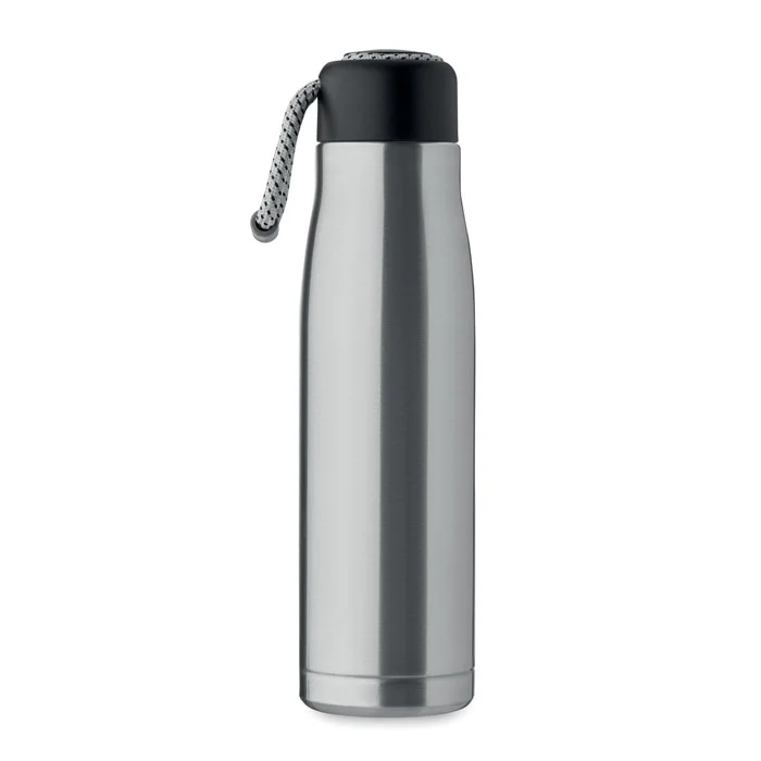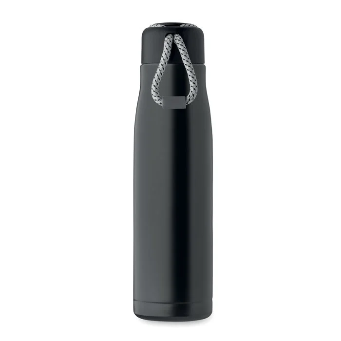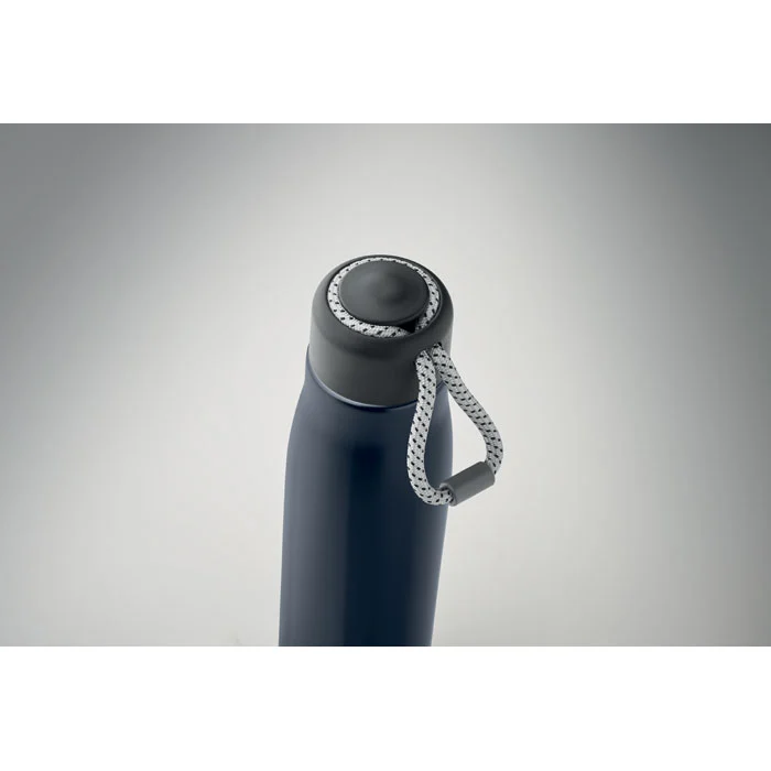 Bouteille à double paroi en acier inoxydable recyclé (90 % d’acier inoxydable recyclé et 10 % d’acier inoxydable) avec poignée en corde insérée dans le bouchon en PP. Anti fuite. Capacité : 500 ml.