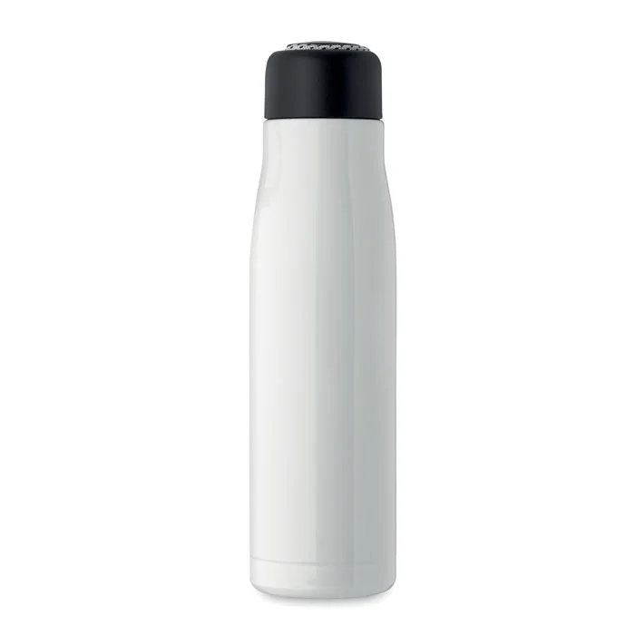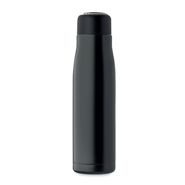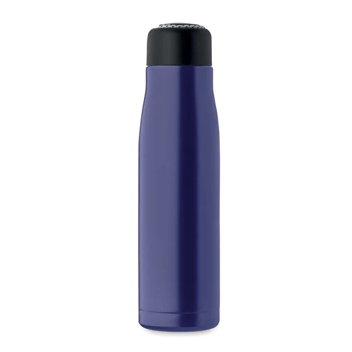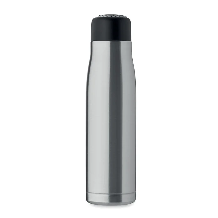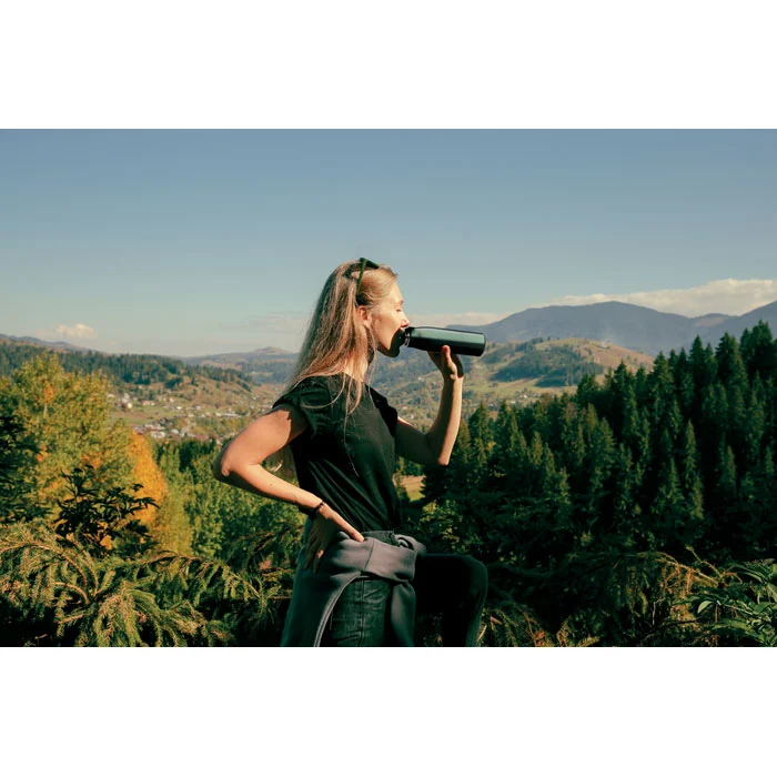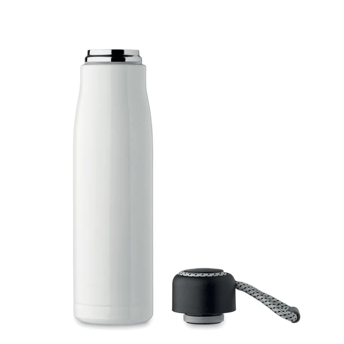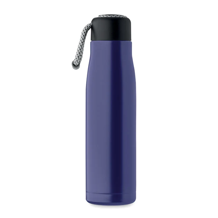 Bouteille à double paroi en acier inoxydable recyclé (90 % d’acier inoxydable recyclé et 10 % d’acier inoxydable) avec poignée en corde insérée dans le bouchon en PP. Anti fuite. Capacité : 500 ml.