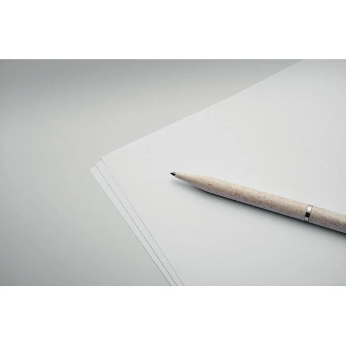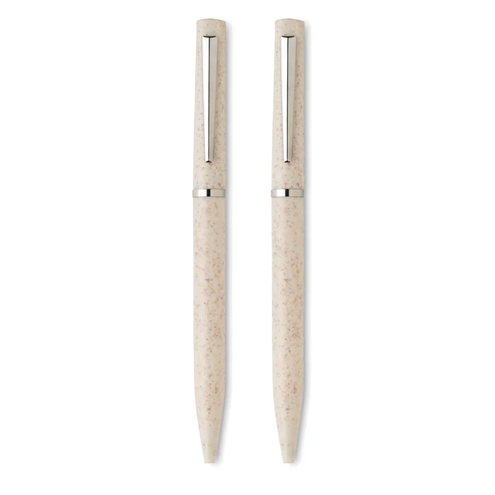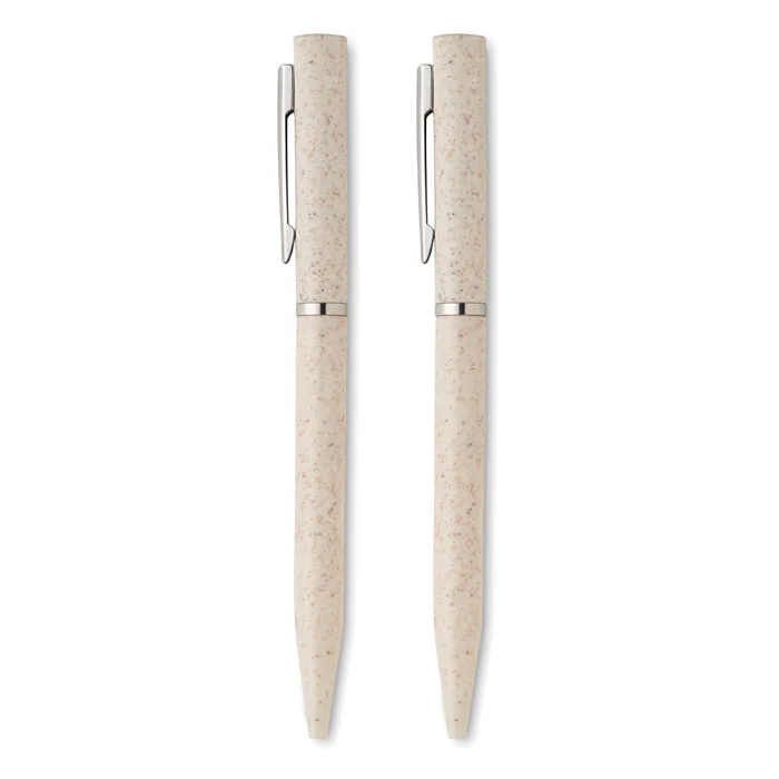 Parure de stylos en paille de blé/ABS comprenant 1 stylo bille twist à encre bleue et 1 stylo bille twist graphite sans encre. Présenté dans une boîte en papier recyclé. FSC®-certified | FSC MIX, P5.1, FSC-C213206