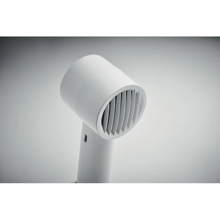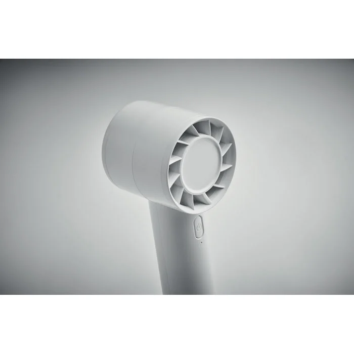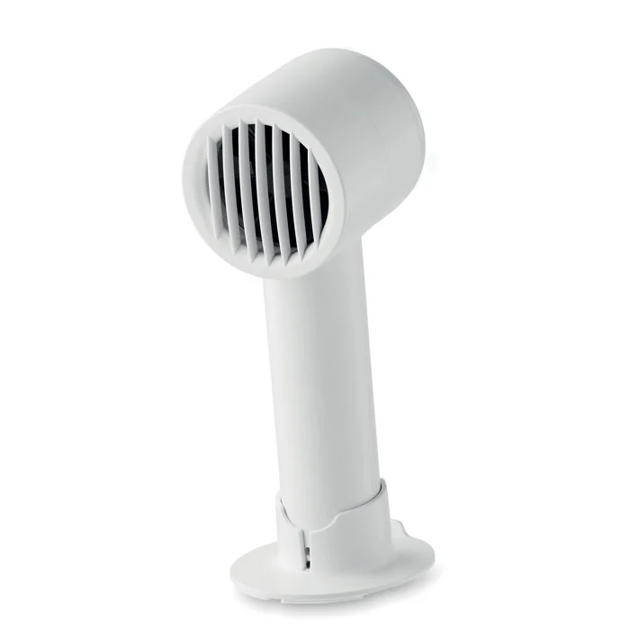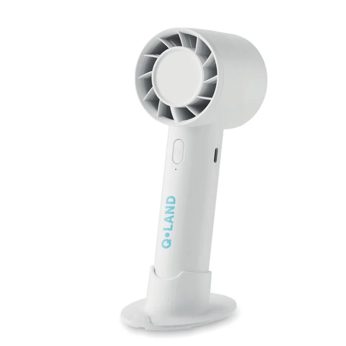 Petit ventilateur portable avec support de bureau et fonction support de téléphone. 3 réglages de vitesse. Batterie rechargeable par port USB 2000 mAh.