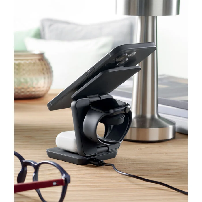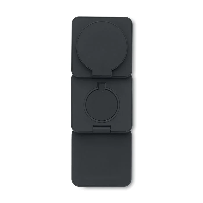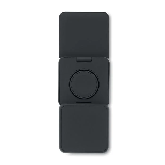 Station de charge pliable 3 en 1 en ABS recyclé caoutchouté. Elle comprend un chargeur magnétique sans fil 15W, un chargeur pour smartwatch (Apple® uniquement) et un chargeur TWS.