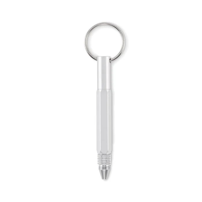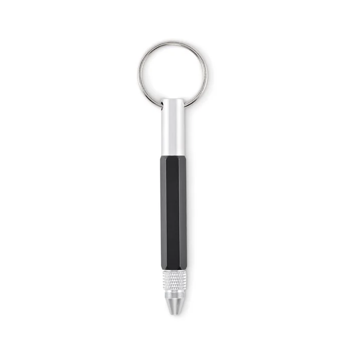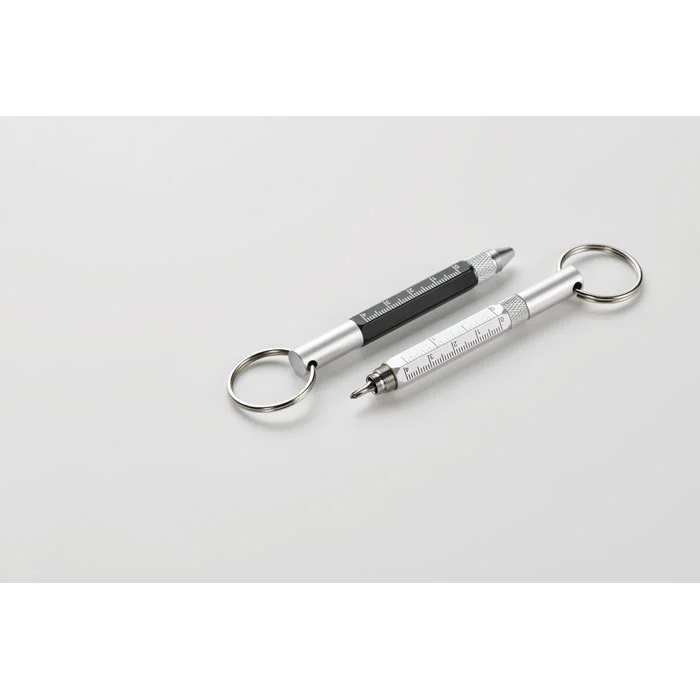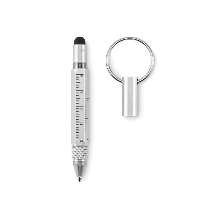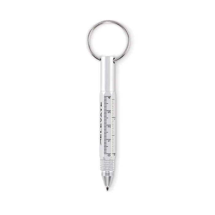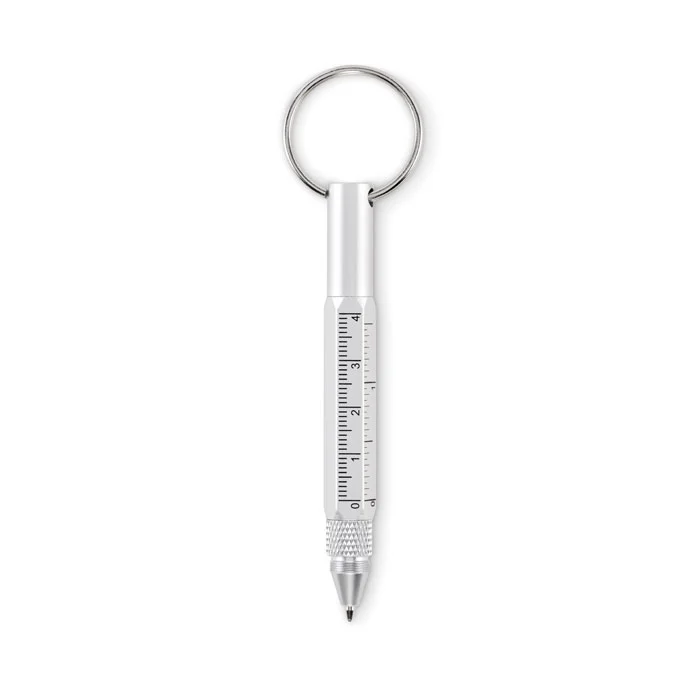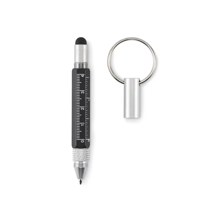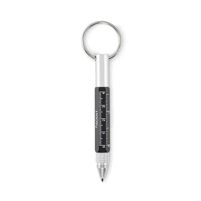 Porte-clés avec stylo twist en aluminium recyclé, règle de 4 cm et de 1,5 pouce, stylet et tournevis 2 en 1 à tête plate et cruciforme. Encre noire.