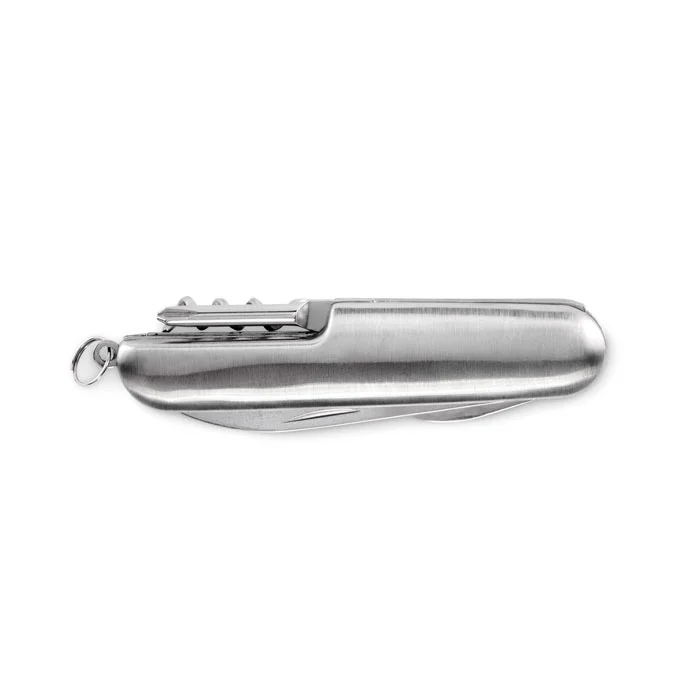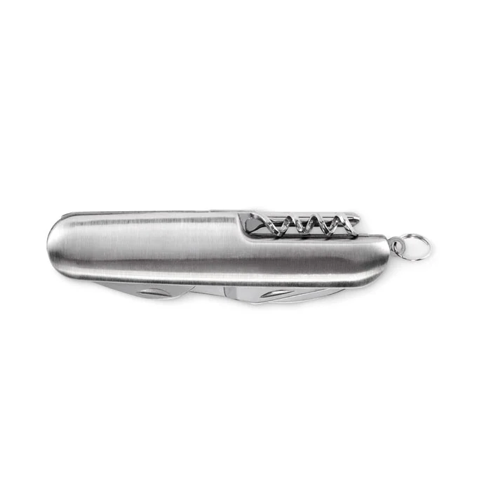 Couteau de poche multifonction en aluminium recyclé. 5 fonctions : grande lame, décapsuleur, tournevis, tire-bouchon et ouvre-boîte.