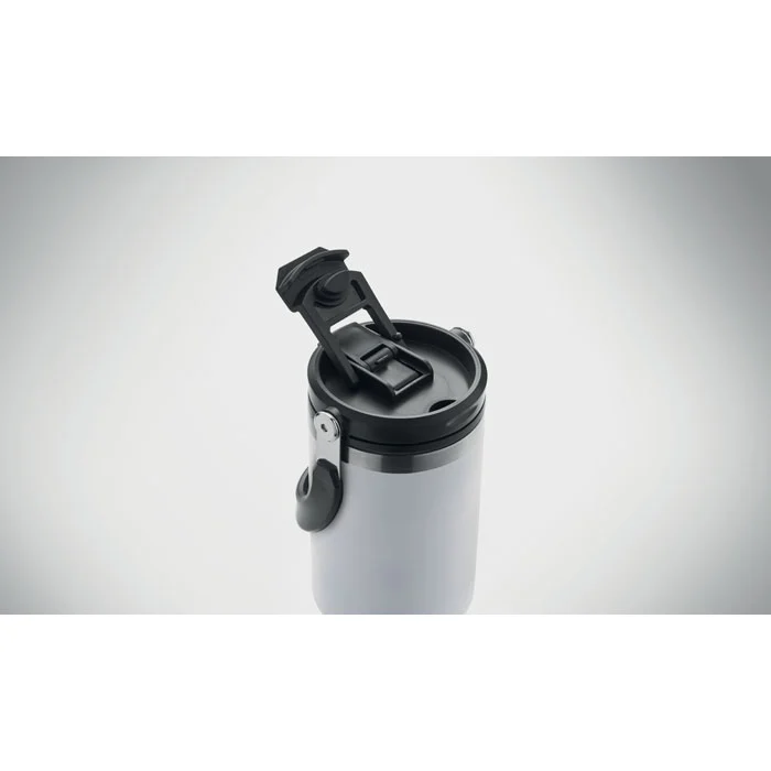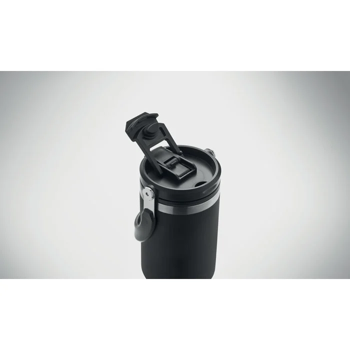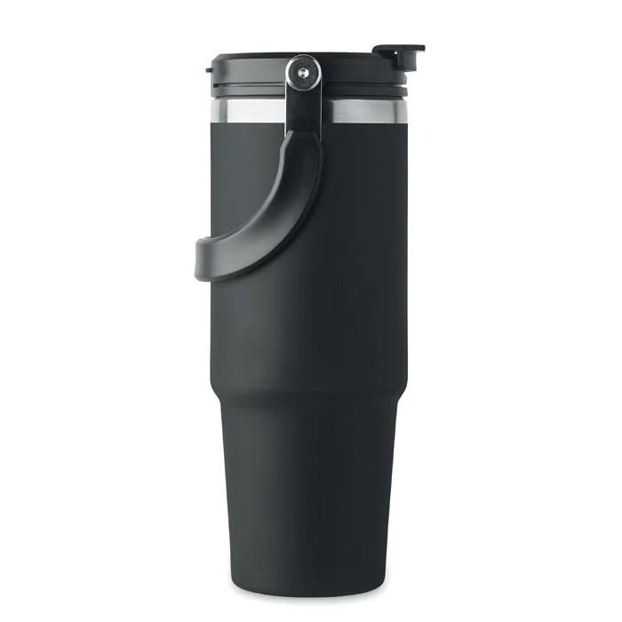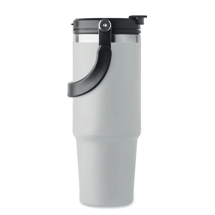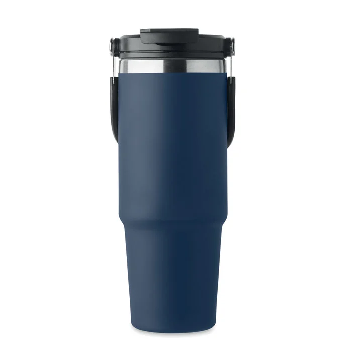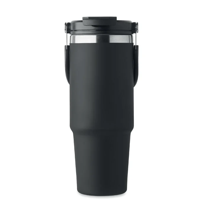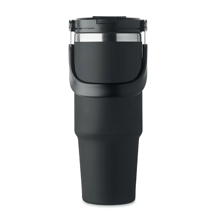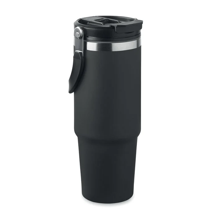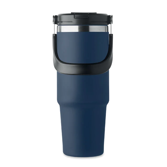 Gobelet à double paroi en acier inoxydable recyclé (90 % d’acier inoxydable recyclé et 10 % d’acier inoxydable) avec couvercle muni d’une paille intérieure, d’un embout pliable et d’une ouverture pour boire directement. Capacité de 850 ml. Anti fuite.