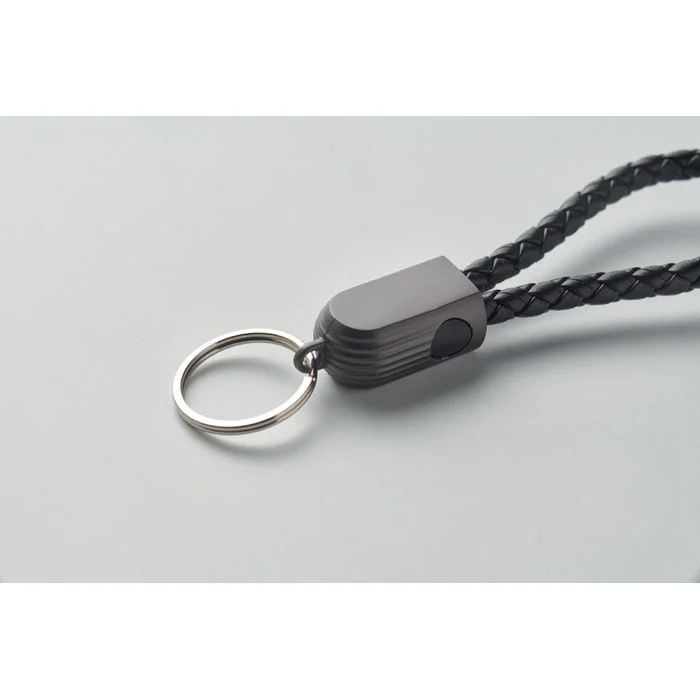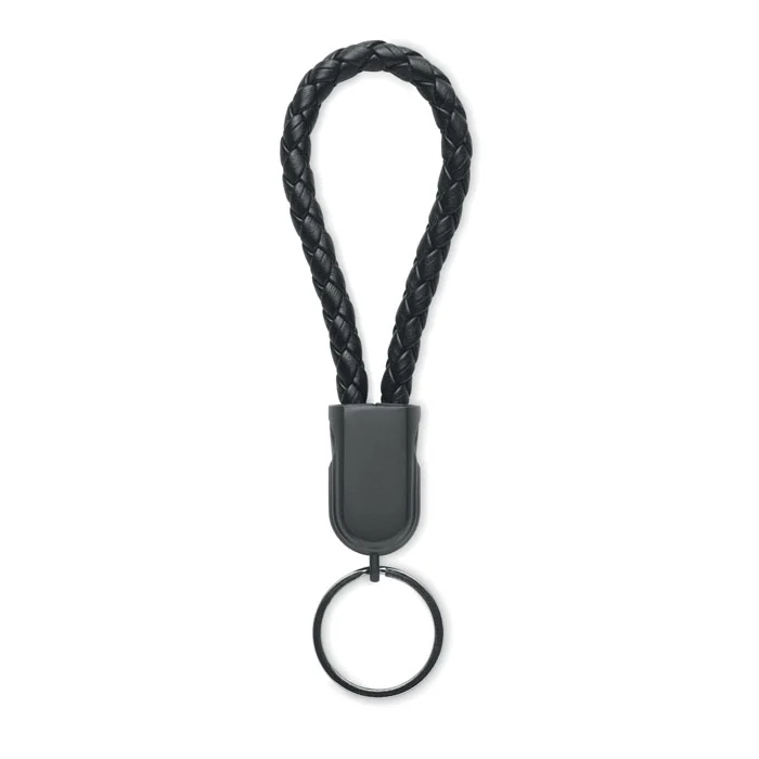 Anneau porte-clés avec câble de recharge 60 W de type C à type C en PU avec détail tressé en alliage de zinc.