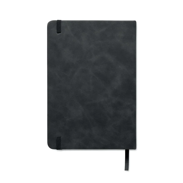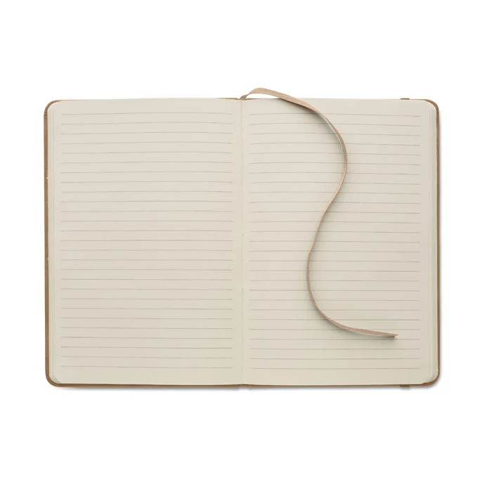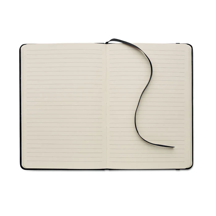 Carnet A5 avec couverture rigide en polyuréthane effet patiné recyclé à 40% et couverture en polyuréthane à 60%. Reliure dos collé. 160 pages lignées, papier recyclé 70 g/m² (80 feuilles). Elastique et Ruban marque pages assortie.