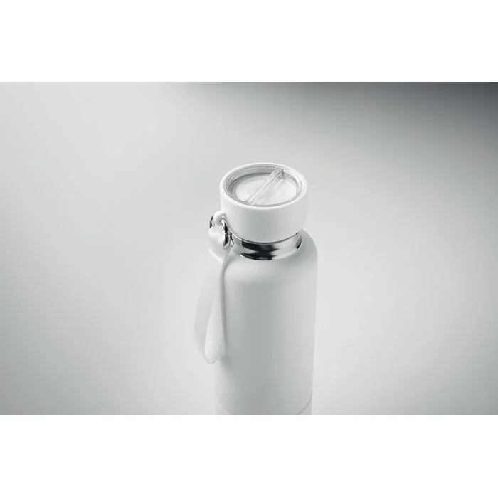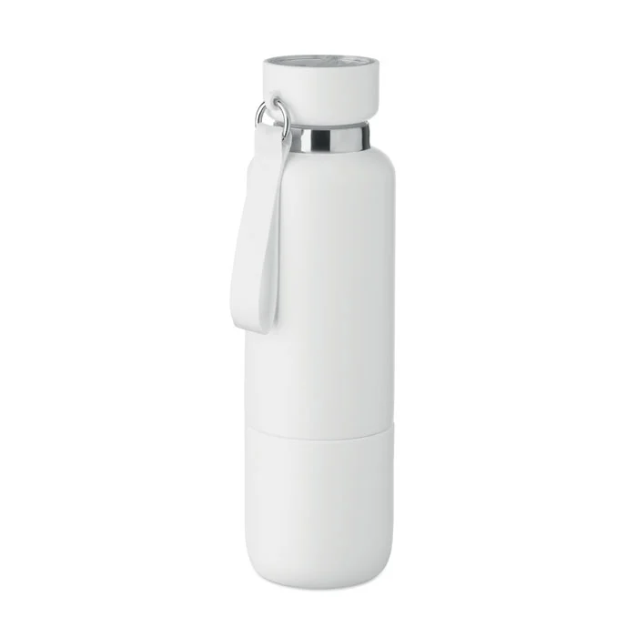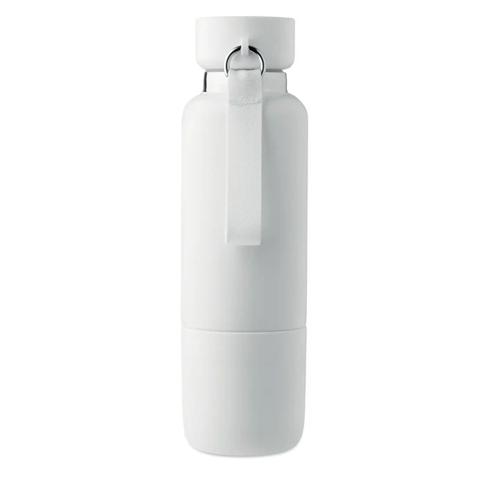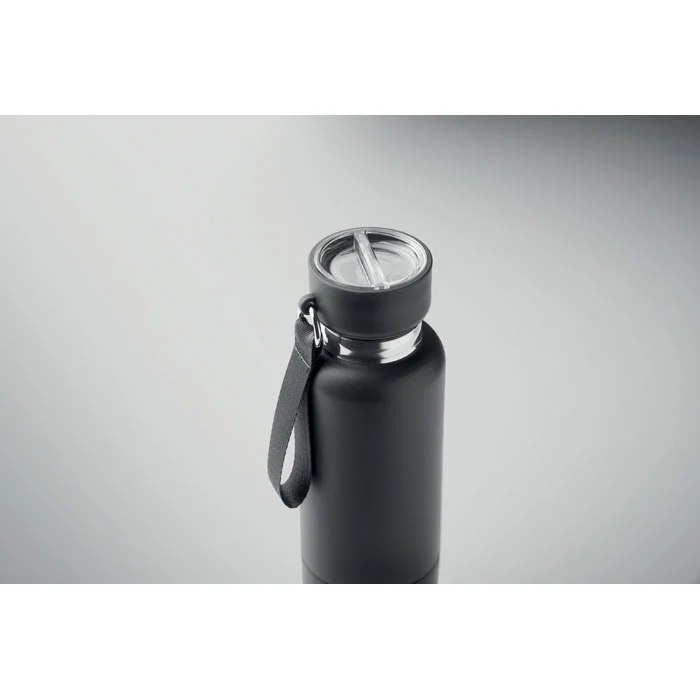 Bouteille isotherme à double paroi en acier inoxydable recyclé (90 %) et en acier inoxydable (10 %), avec poignée intégrée et longue sangle supplémentaire (70 cm) dans le couvercle en PP. Anti fuite. Gobelet inclus. Capacité 500 ml.
