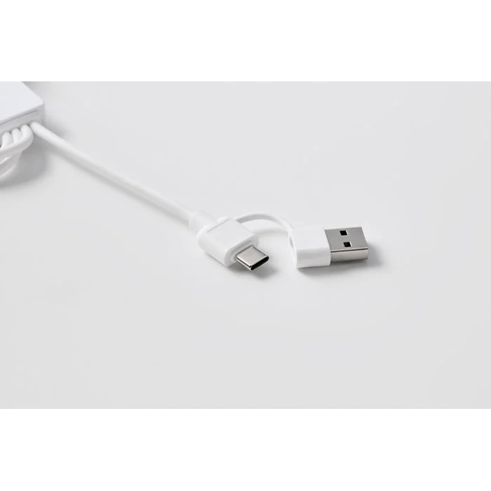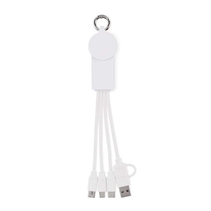 Porte-clés 2 en 1 avec câble de chargement avec entrée type-C & type-A. Sortie : Chargement des montres (Samsung® et Apple®), 2 x type-C et micro-B (2 en 1 broche). Câble en TPE recyclé.