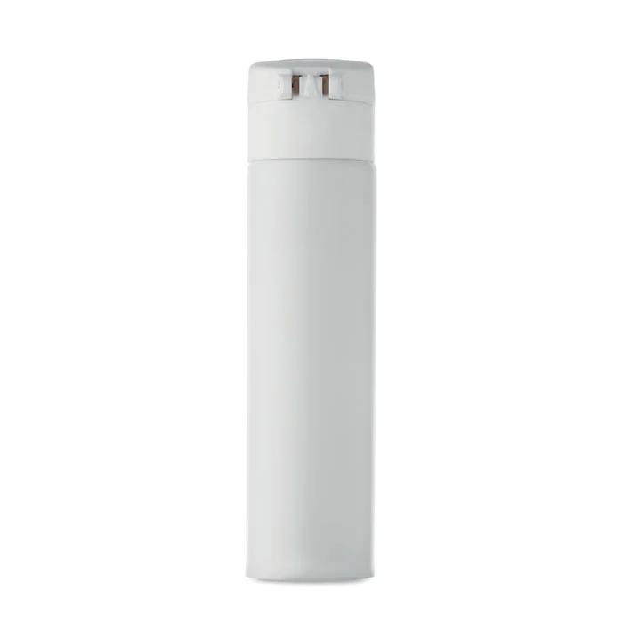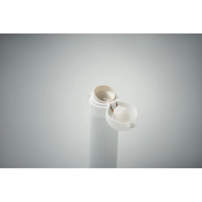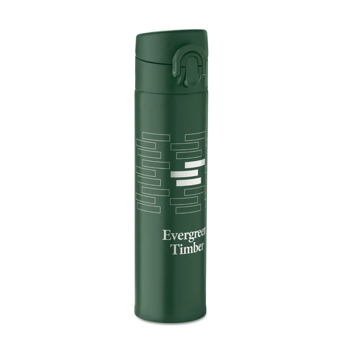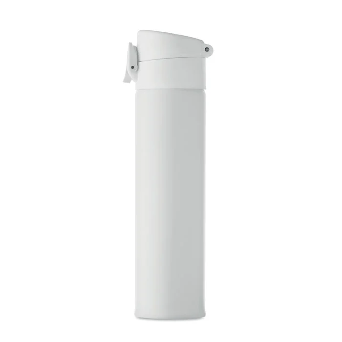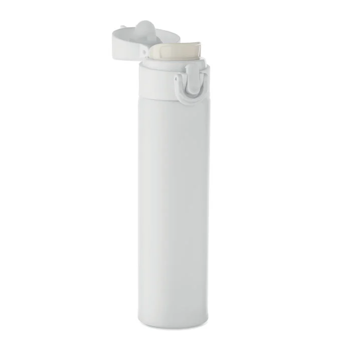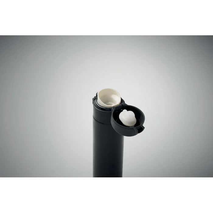 Bouteille à double paroi en acier inoxydable recyclé (90 % d’acier inoxydable recyclé et 10 % d’acier inoxydable) avec fermeture de sécurité sur le couvercle et option d’ouverture par pression. Anti fuite. Capacité 300 ml.