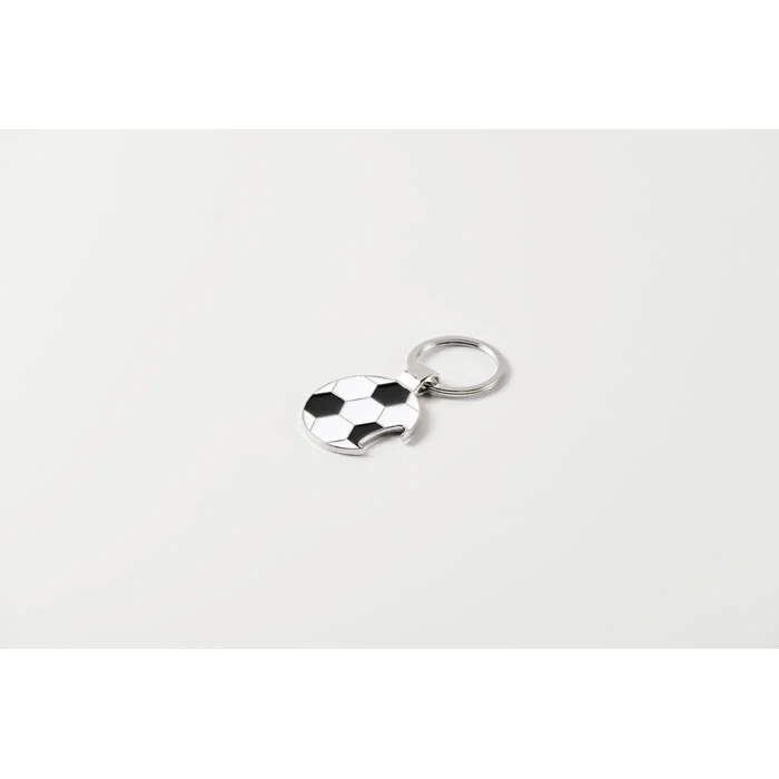Porte-clés décapsuleur en forme de ballon de football, en alliage de zinc avec anneau en fer.