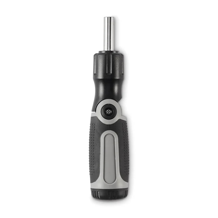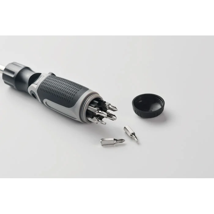 Jeu de tournevis pliables avec manche en ABS et 12 embouts en fer, dont des cruciformes, des têtes plates, des hexagones et des torx.