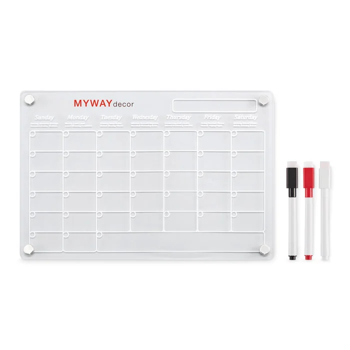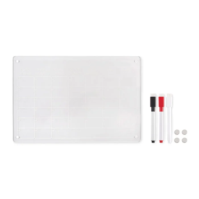 Planning mensuel magnétique en acrylique au format A4 avec 3 marqueurs magnétiques effaçables (noir, rouge et blanc). Vis de fixation incluses.