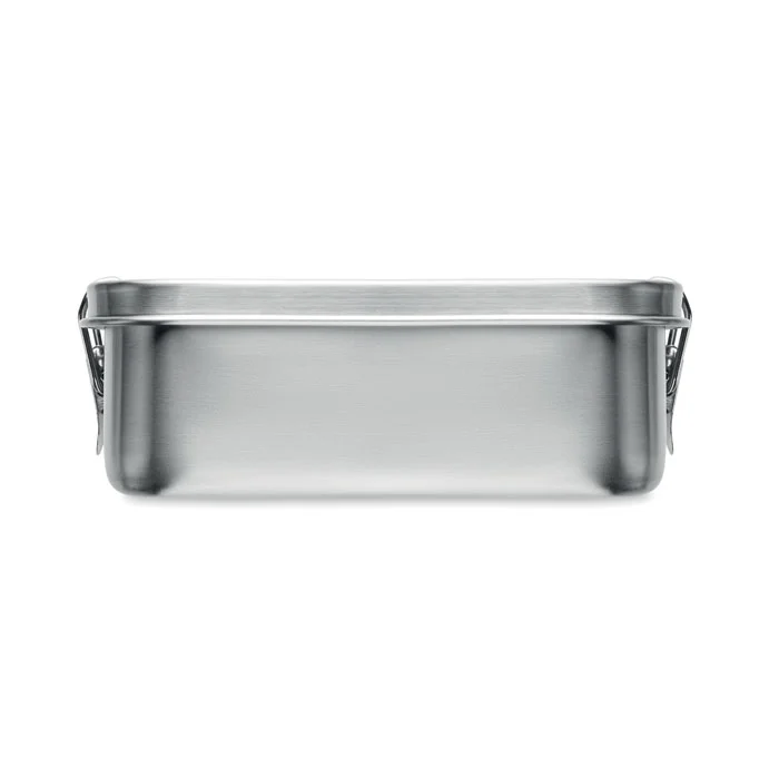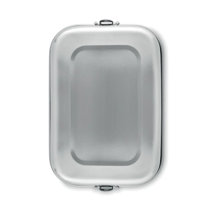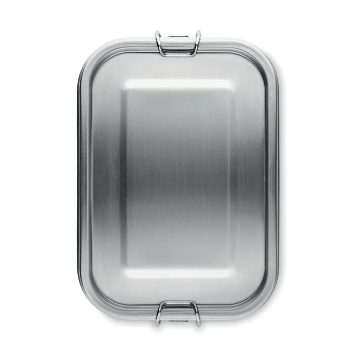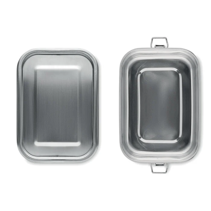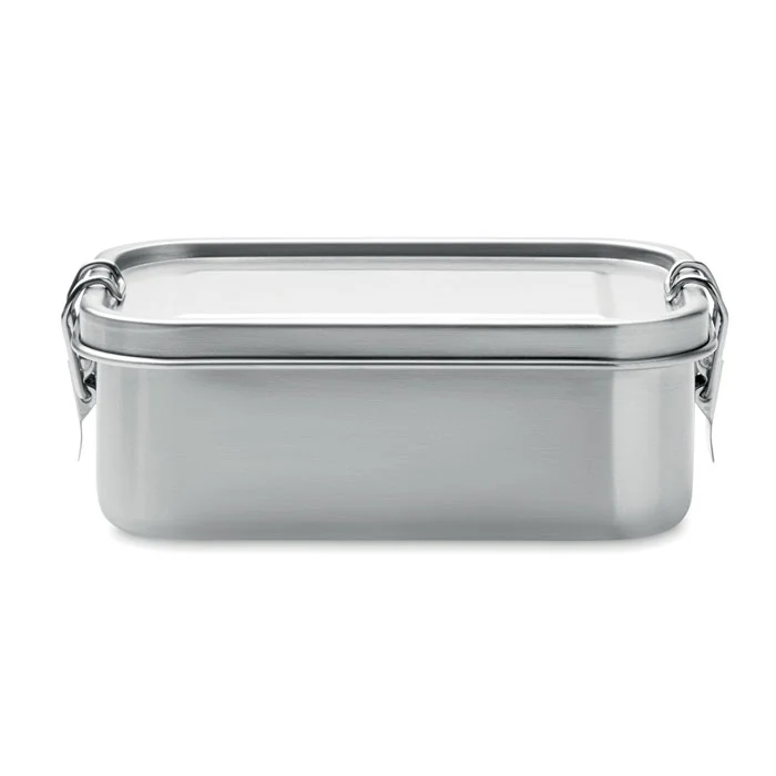 Boîte à lunch en acier inoxydable recyclé (90 % d’acier inoxydable recyclé et 10 % d’acier inoxydable) avec boucles latérales sécurisées et coins arrondis. Capacité : 750 ml.