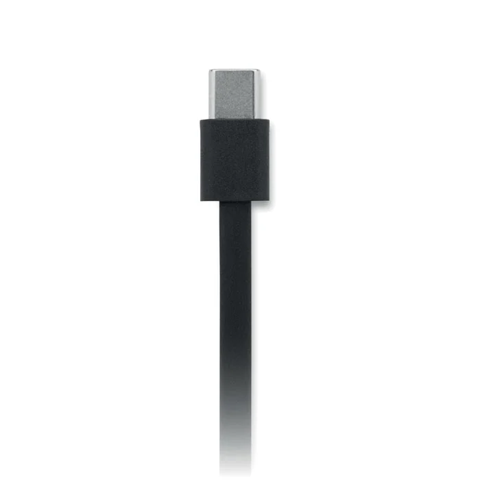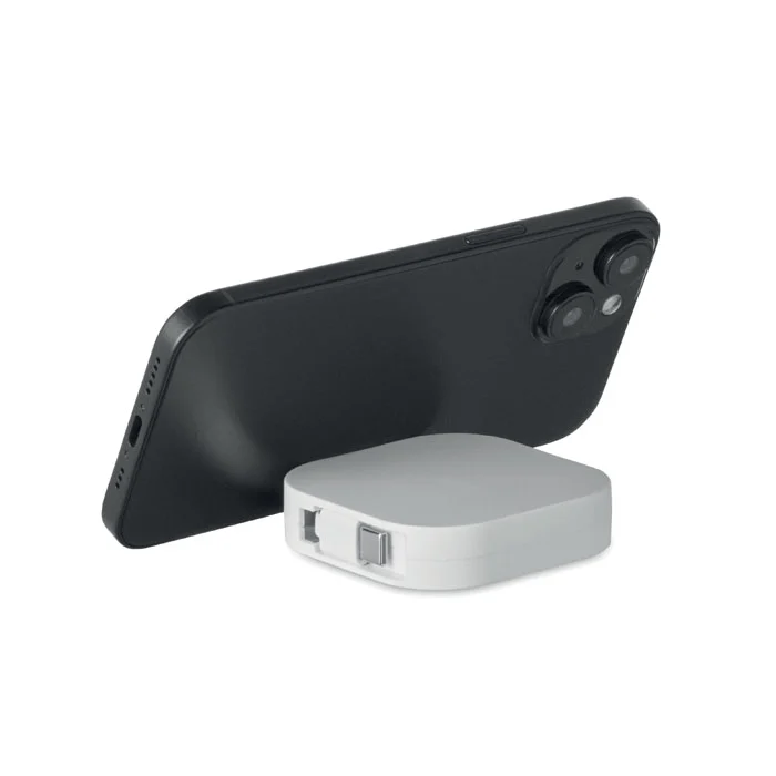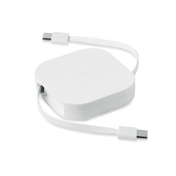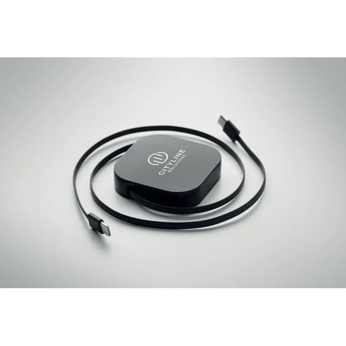 Câble de charge et de données rétractable de 100 W. Fonctionnalité de support de téléphone incluse. Câble en PVC avec boîtier en ABS pour l’alimentation et le transfert de données (480 Mbps). Connexion Type-C à Type-C.
