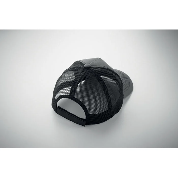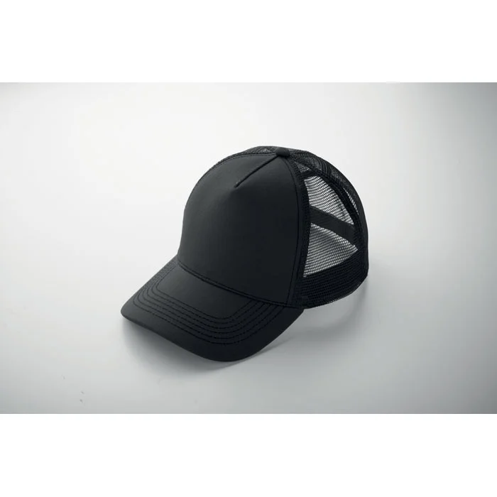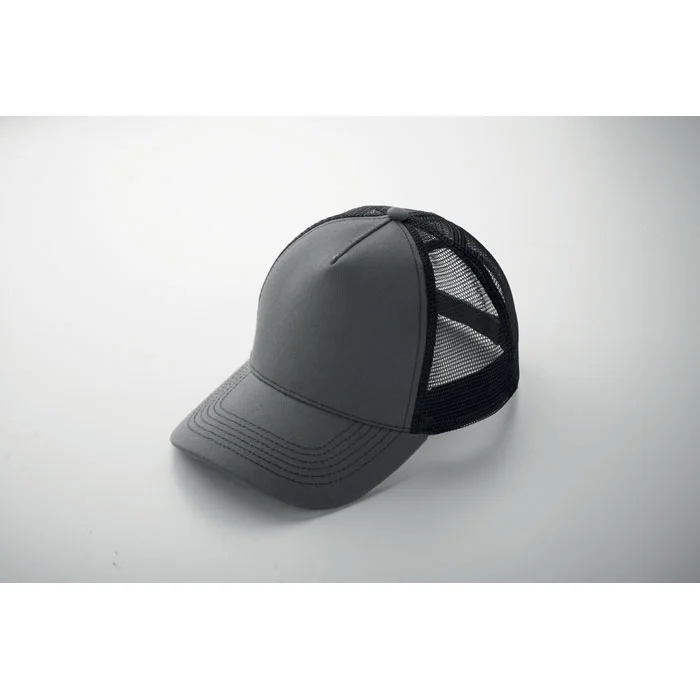 Casquette trucker à 5 panneaux avec panneau avant et visière en coton 250 gr/m², maille arrière en polyester, fermeture auto-agrippante.