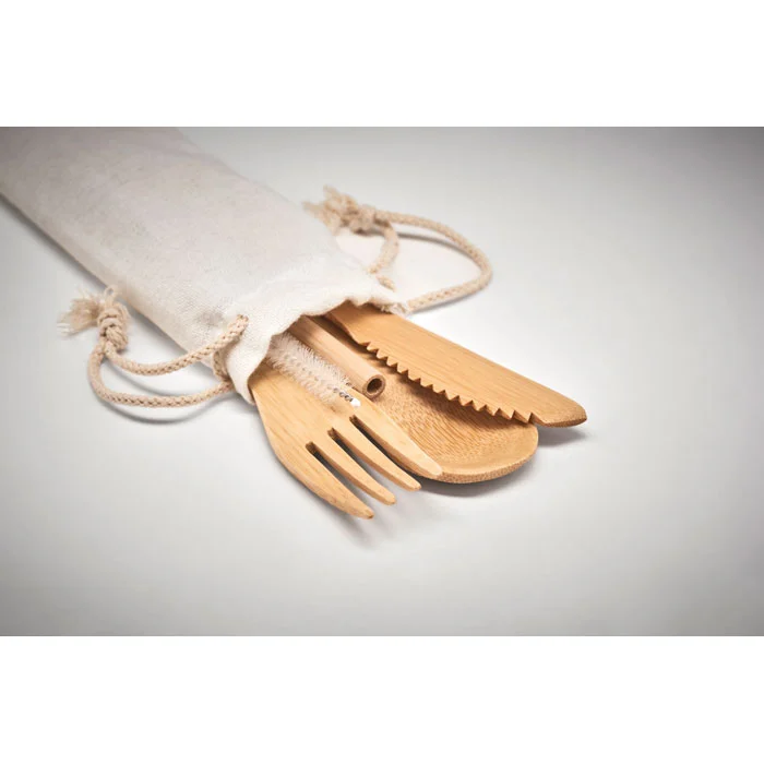 Ensemble de couverts en bambou réutilisables dans une pochette en toile. Comprend un couteau, une fourchette, une cuillère, une paille en bambou et un écouvillon en acier inoxydable. Le bambou est un produit naturel, et présente de légères variations de couleur, de décoration et de tailles.