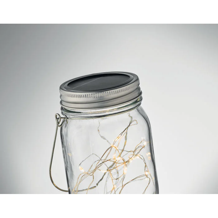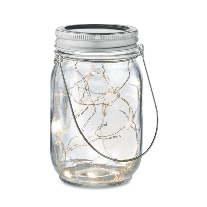 Lampe solaire d’extérieur en forme de pot avec guirlande lumineuse à 20 LED. Suspension sur le dessus. Durée de fonctionnement d’environ 5 heures. Batterie 300 mAh NI-MH incluse. IP44.