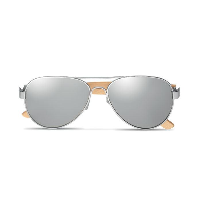 Lunettes de soleil avec branches en bambou et verres miroirs Couleurés dans une pochette en microfibre. Protection UV400. Le bambou est un produit naturel, et présente de légères variations de couleur, de décoration et de tailles.