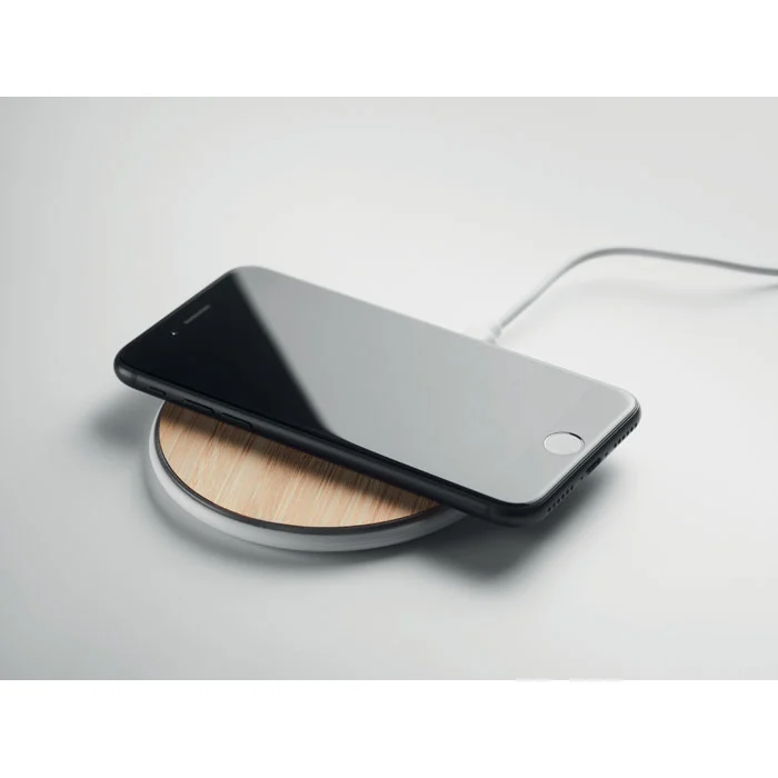 Chargeur sans fil 15W avec dessus en bambou et base en ABS. Connectez l’appareil à votre ordinateur, placez le smartphone dessus et laissez-le se charger. Sortie : DC 9V/1.10A pour une charge rapide. Le bambou est un produit naturel, et présente de lég