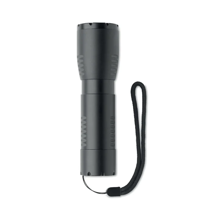 Petite lampe torche à LED zoomable en aluminium et sangle détachable. Sortie : 200 lumen. 3 piles AA non comprises.