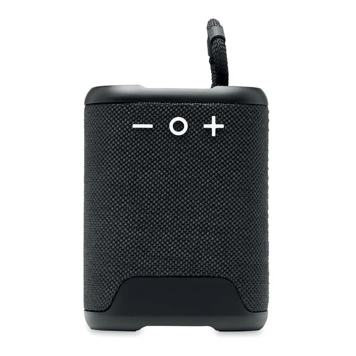 Haut-parleur sans fil 5.0 en ABS avec finition en tissu 30 % chanvre et 70 % polyester, étanche aux éclaboussures IPX7 avec poignée. 1 Batterie rechargeable Li-Ion 1800 mAh. Données de sortie : 5W, 4 Ohm. Durée de lecture d’environ 8h.