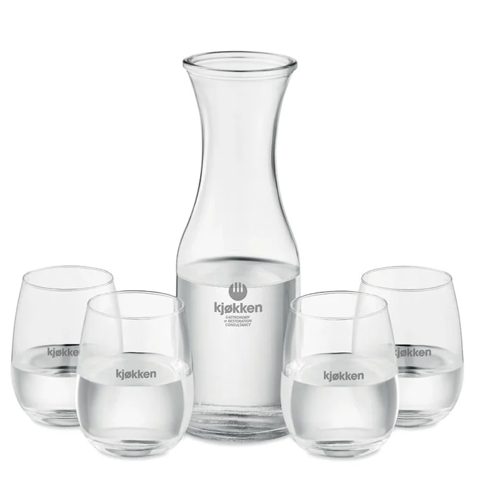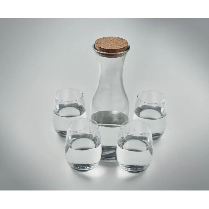 Set de boisson en verre recyclé. Comprenant : Carafe (1L) avec couvercle en liège et 4 verres (420 ml). Le liège est un matériau 100% naturel. En raison de sa structure et de la porosité de sa surface, le résultat final de l’impression par article peut présenter des différences.