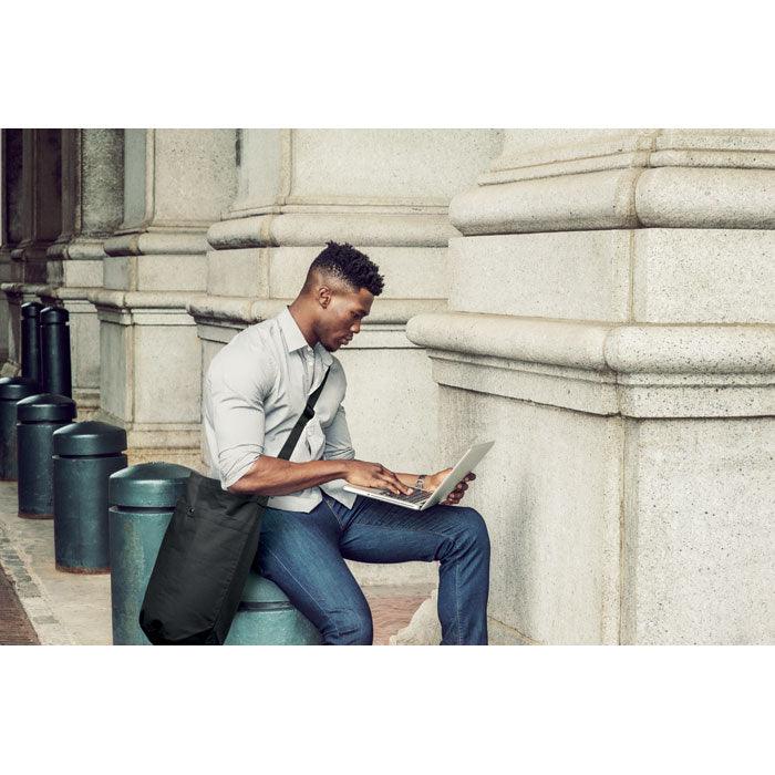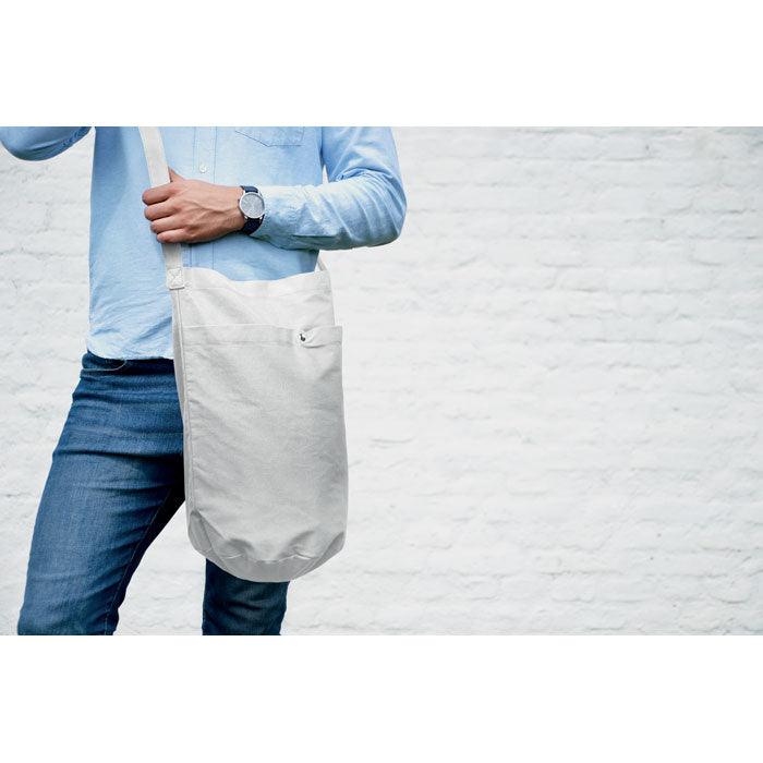 Sac en toile avec une longue bandoulière réglable et une grande poche frontale avec fermeture à bouton-pression. Comprend une poche intérieure. 270 gr/m².