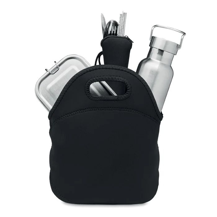 Set à déjeuner présenté dans un sac en néoprène. Comprend une bouteille en acier inoxydable à double paroi (500 ml), une lunchbox (600 ml) et des couverts dans une pochette en néoprène à fermeture éclair.