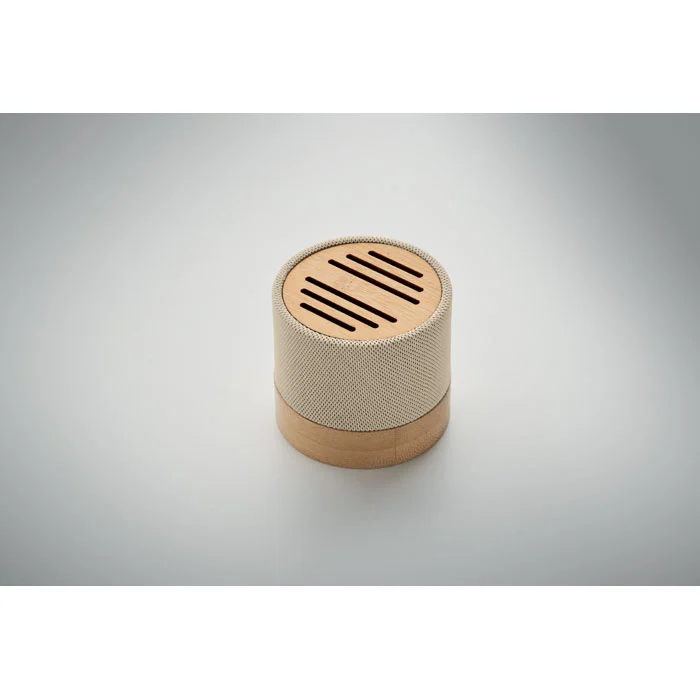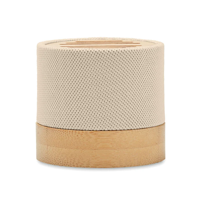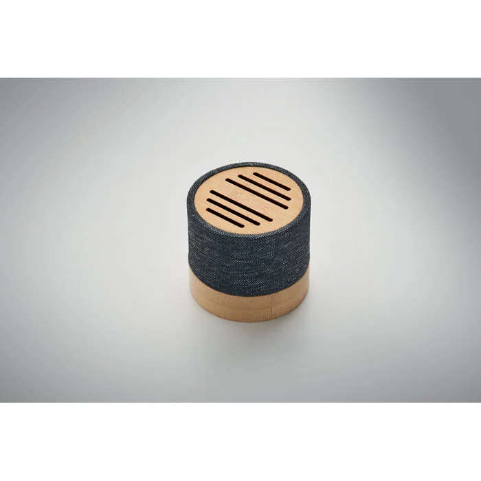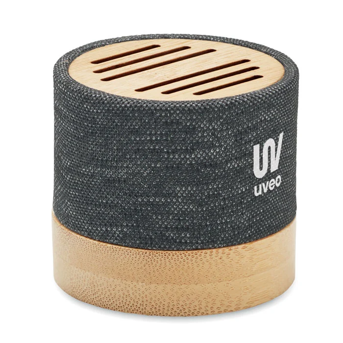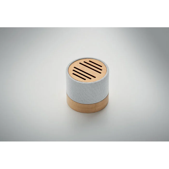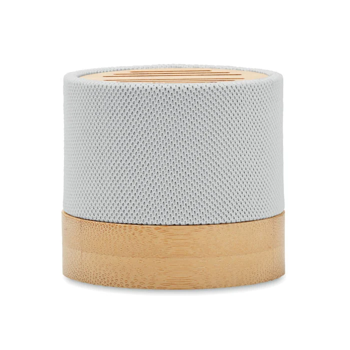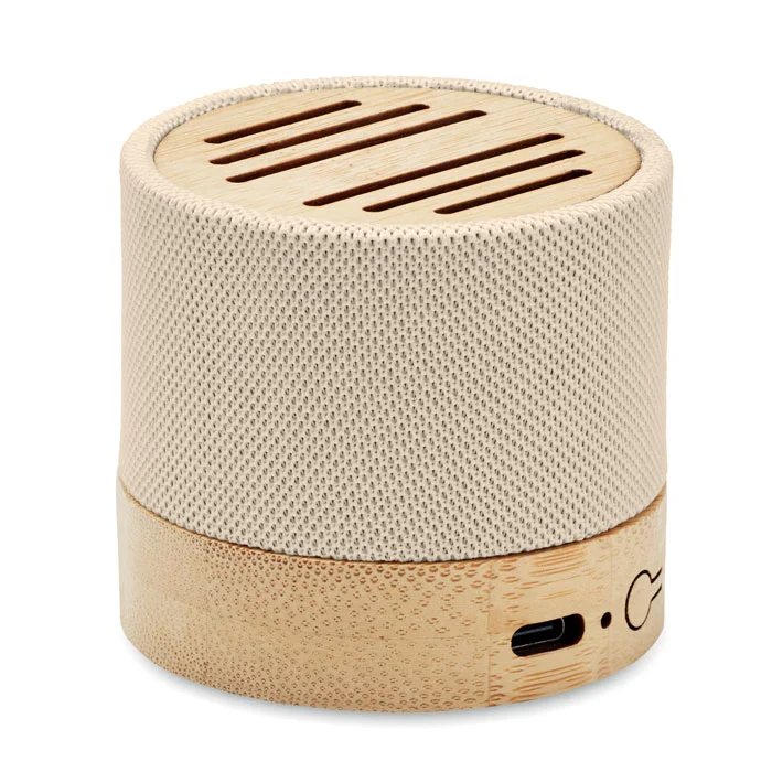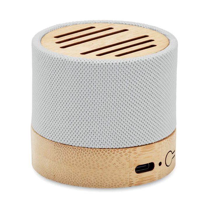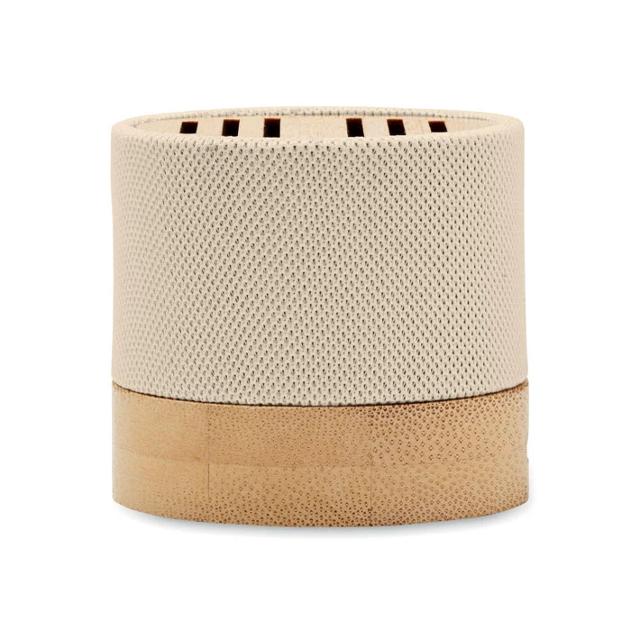 Haut-parleur sans fil 5.0 en RPET détail et bambou. Témoin LED. 1 Batterie rechargeable Li-ION 300 mAh incluse. Port pour carte SD et câble AUX/USB inclus. Données de sortie : 3W, 3 Ohm et 5V. Durée de lecture d’env. 3h. Le bambou est un produit naturel, et présente de légères variations de couleur, de décoration et de tailles.