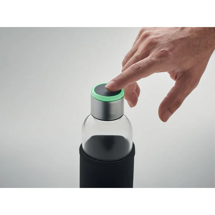 Bouteille en acier en verre borosilicate avec rappel d’hydratation dans une pochette. La lumière du capteur s’allume toutes les heures pour vous rappeler qu’il est temps de boire. Comprend 1 pile CR2032. Capacité : 500 ml.