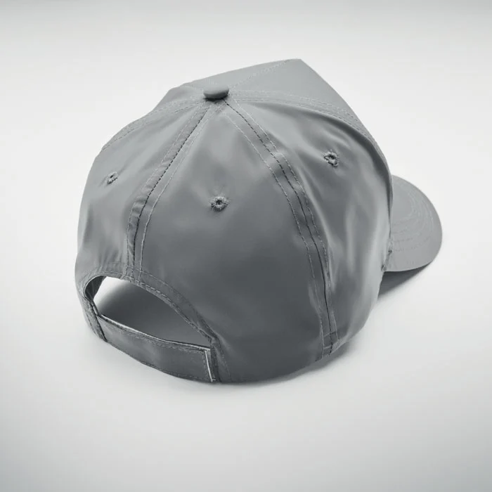 Casquette de baseball à 5 panneaux en polyester 190T hautement réfléchissant. 4 œillets cousus avec fermeture auto-agrippante. Taille 7 1/4.