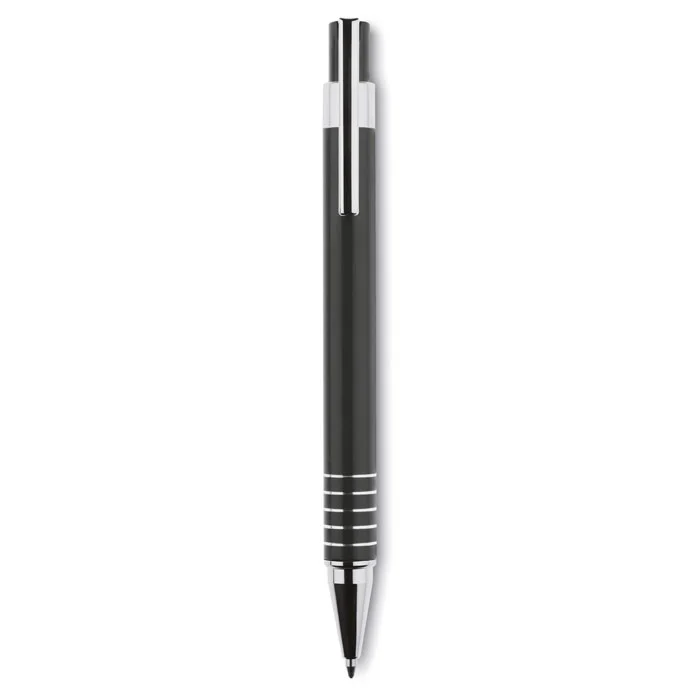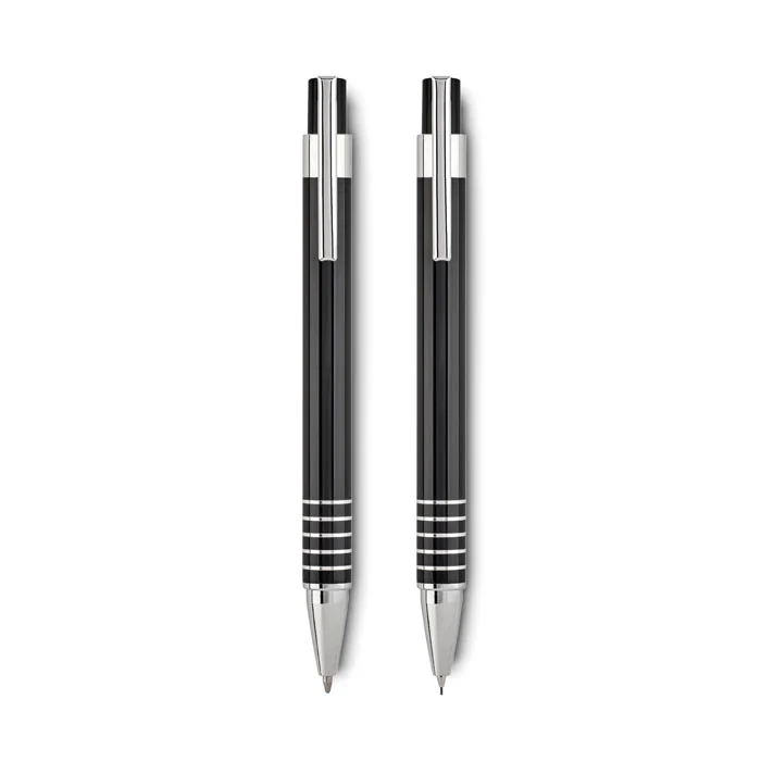 Set stylo en aluminium comprenant un stylo bille poussoir à encre bleue et un portemine dans un coffret métal.
