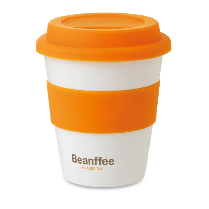 Gobelet simple paroi en PP blanc brillant avec couvercle et bande en silicone. Contenance 350ml. La simple paroi n’empêche pas le transfert de chaleur.