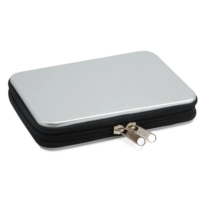 Jeu d’outils présenté dans une boite en aluminium contenant 1 pince, 1 pince coupante, 1 tournevis , 1 rallonge, un ensemble de 10 embouts, 1 mini pince et 6 tournevis de précision.