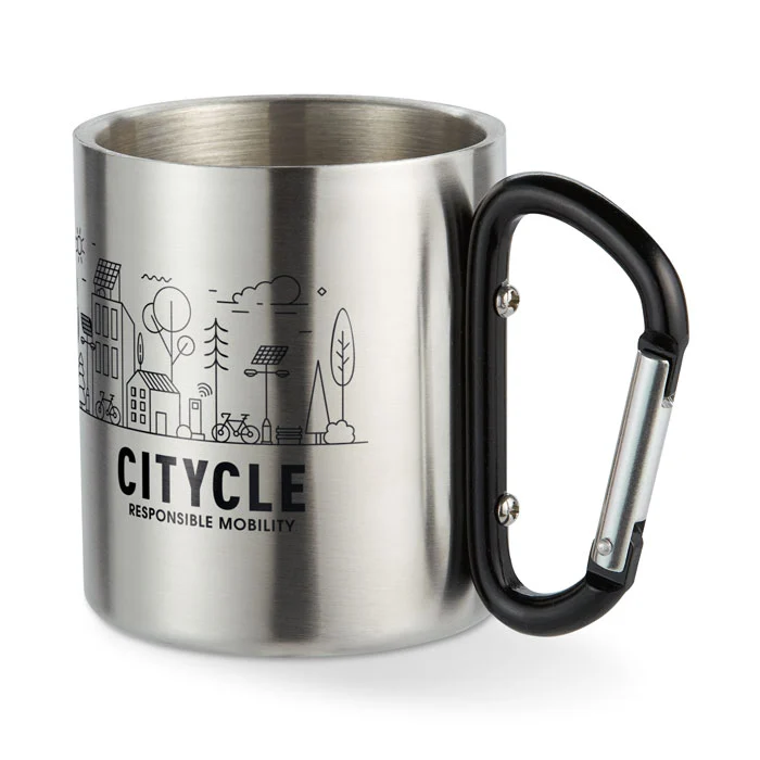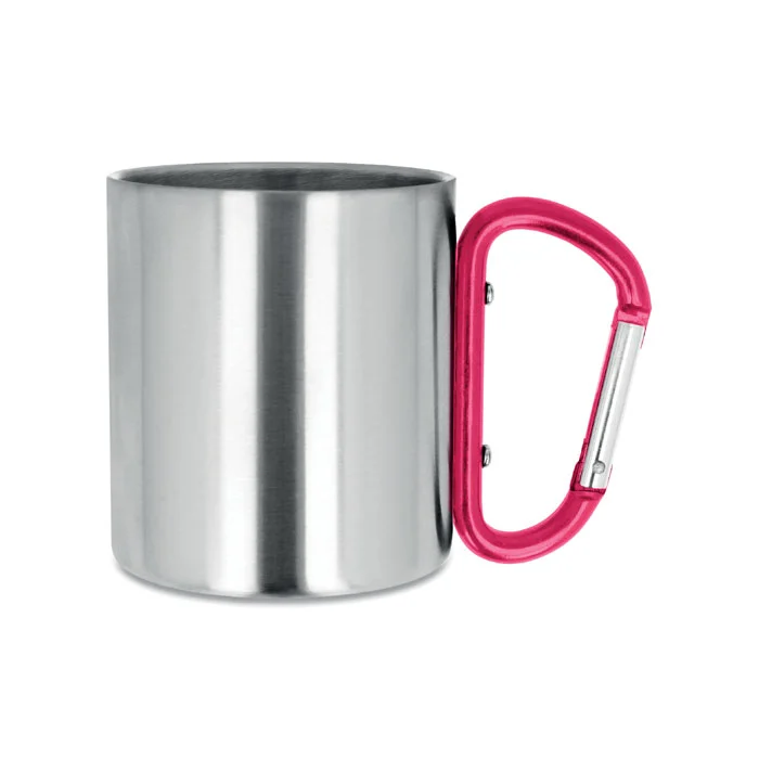 Mug double paroi en acier inoxydable, anse avec mousqueton. Contenance 220 ml.