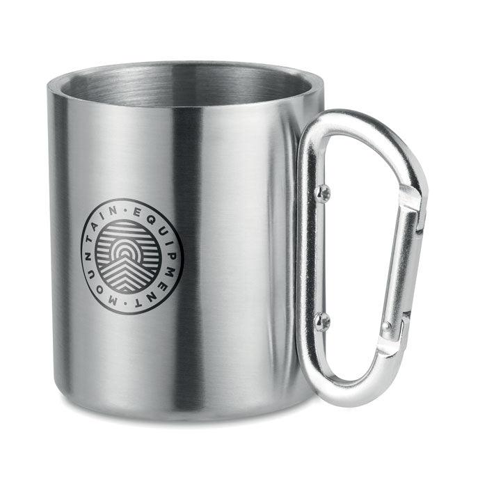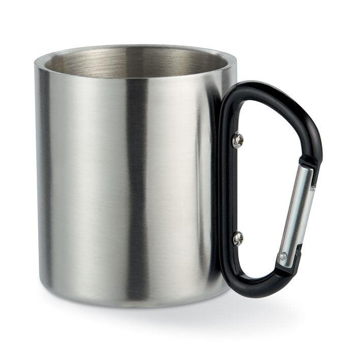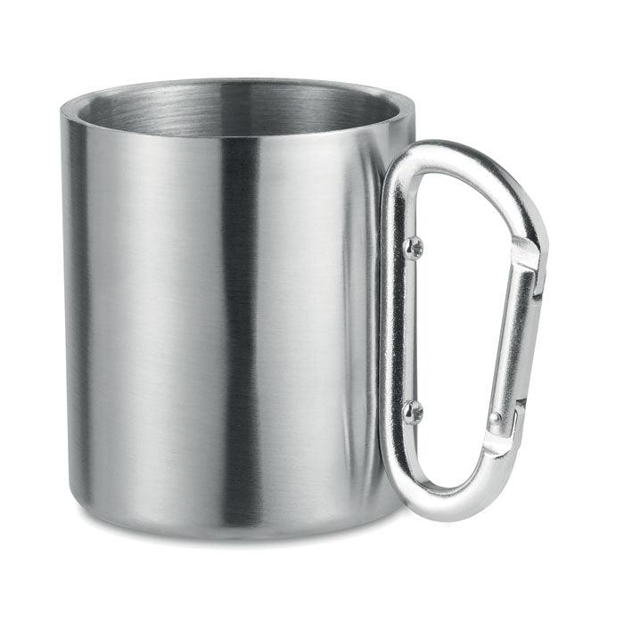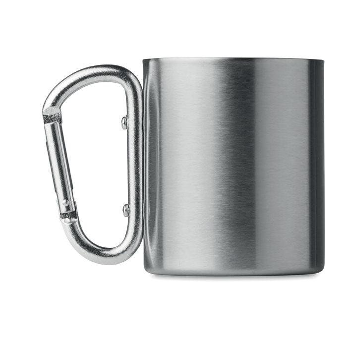 Mug double paroi en acier inoxydable, anse avec mousqueton. Contenance 220 ml.