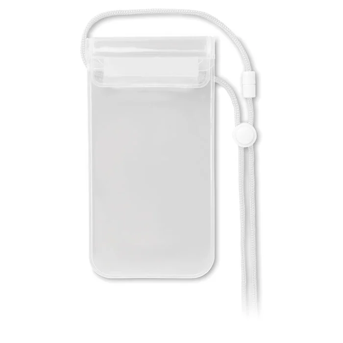 Pochette étanche pour smartphone en PVC avec cordon en polyester. Bouton et fermeture de sécurité . La pochette a une surface qui permet le fonctionnement de l’écran tactile de l’extérieur.
