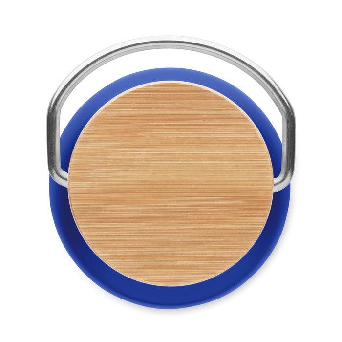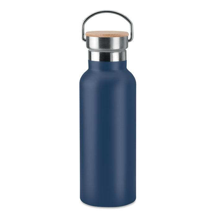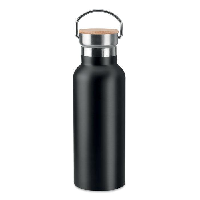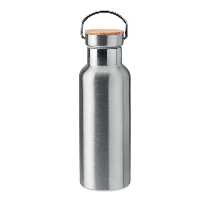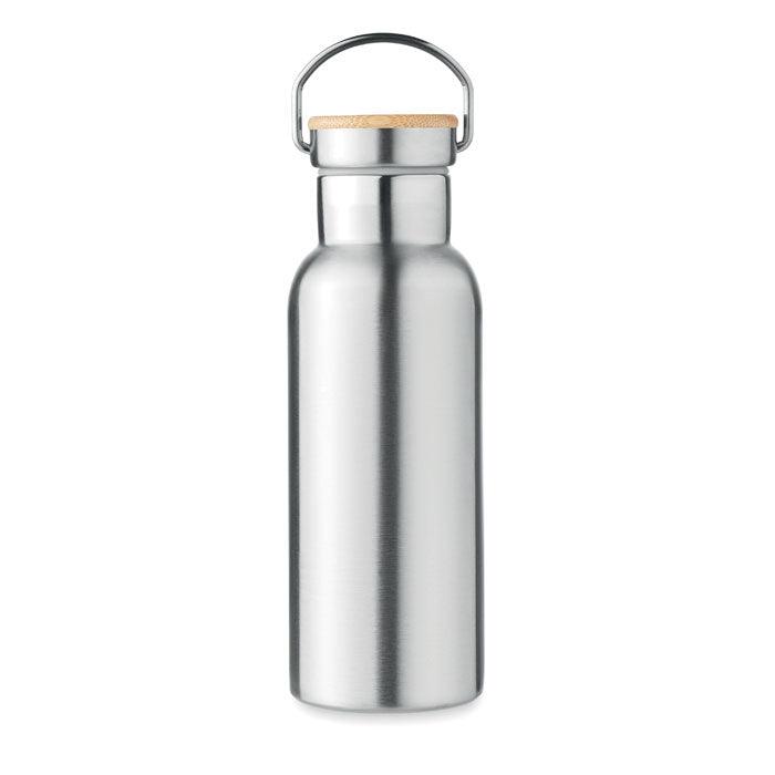 Bouteille isotherme à double paroi en acier inoxydable avec bouchon en bambou et poignée. Contenance 500 ml. Anti fuite. Le bambou est un produit naturel, et présente de légères variations de couleur, de décoration et de tailles.