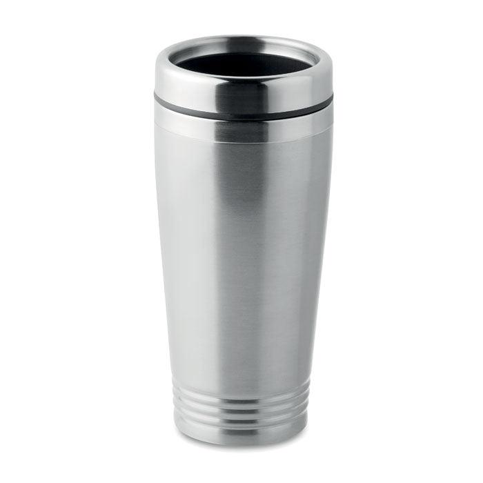Tasse de voyage à double paroi en acier inoxydable avec couvercle en PP noir. Contenance : 400 ml.