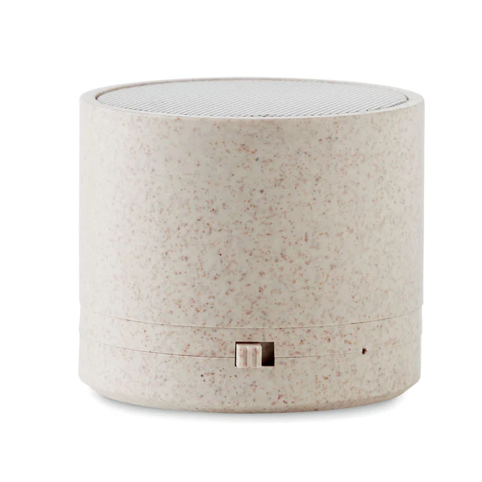 Haut-parleur sans fil 5.1 en paille de blé (35%) et ABS (65%) avec témoin lumineux. 1 pile rechargeable au lithium 300 mAh incluse. Données de sortie: 3W, 3 Ohm et 5V. Temps de jeu approx. 2h