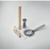 Kit cocktail dans une pochette en coton avec fermeture par cordon. Comprend 5 pièces : un jigger double face (15 et 30 ml), un mélangeur en bois, une passoire à cocktail, un agitateur et un limonadier. Pochette en 220 gr/m².