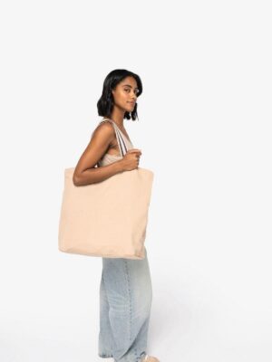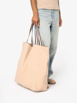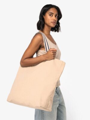 Hemp & Horizon Blue : 75% coton recyclé pré-consumer / 22% polyester recyclé post-consumer / 3% autres fibres. Rosewood & Topaz Blue : 67% coton recyclé pré-consumer / 30% polyester recyclé post-consumer / 3% autres fibres. ONE SIZE (50 x 16 x 60cm). Capacité : 48L. Anses contrastés avec des graphismes rayés de 60cm de long et 4.25cm de large.