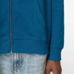 85% coton biologique / 15% polyester recyclé post-consumer. Coton peigné ringspun. Coupe ajustée. Lavé aux enzymes. Molleton gratté 3 fils LSF (Low Shrinkage Fleece : molleton pré-rétréci). Zip métal. 1/2 lune au dos. 2 poches kangourou. Bord cote 1 x 1 bas de vêtement et bas de manches. Double surpiqûre bas de manches, emmanchures, bas de vêtement. Capuche doublée en matière principale avec point d’arrêt cordon. Cordon rond avec embouts et oeillets en métal recyclé. Bande de propreté intérieure en chevrons.