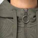 85% coton biologique / 15% polyester recyclé post-consumer. Coton peigné. Coupe confort avec épaules tombantes. Molleton non gratté (French Terry). 3 fils LST (Low Shrinkage Terry : pré-rétréci). 1/2 lune dans le dos. Lavé aux enzymes. Zip en métal recyclé avec tirette en forme arrondie. Deux poches plaquées devant avec rabat. Capuche à pince doublée en matière principale. Cordon de serrage plat en coton biologique. Bande de propreté intérieure encolure en chevrons. Finition bas de manches en bord côte 1 x 1. Finition bas de vêtement en simple surpiqûre. Finition intérieure du zip avec biais de propreté en jersey.