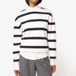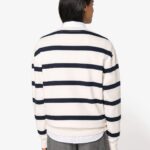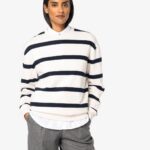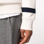 85% coton biologique / 15% polyester recyclé post-consumer. Coton peigné. Coupe droite à épaules tombantes. Molleton gratté 3 fils LSF (Low Shrinkage Fleece : molleton pré-rétréci). Rayures marines imprimées sur toute la surface. Lavé aux enzymes. Bord côte 1 x 1 au col, bas de manches et bas de vêtement. Finition intérieur col avec bande de propreté en jersey ton sur ton. Demi-lune au dos.