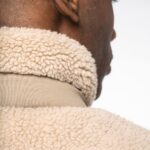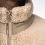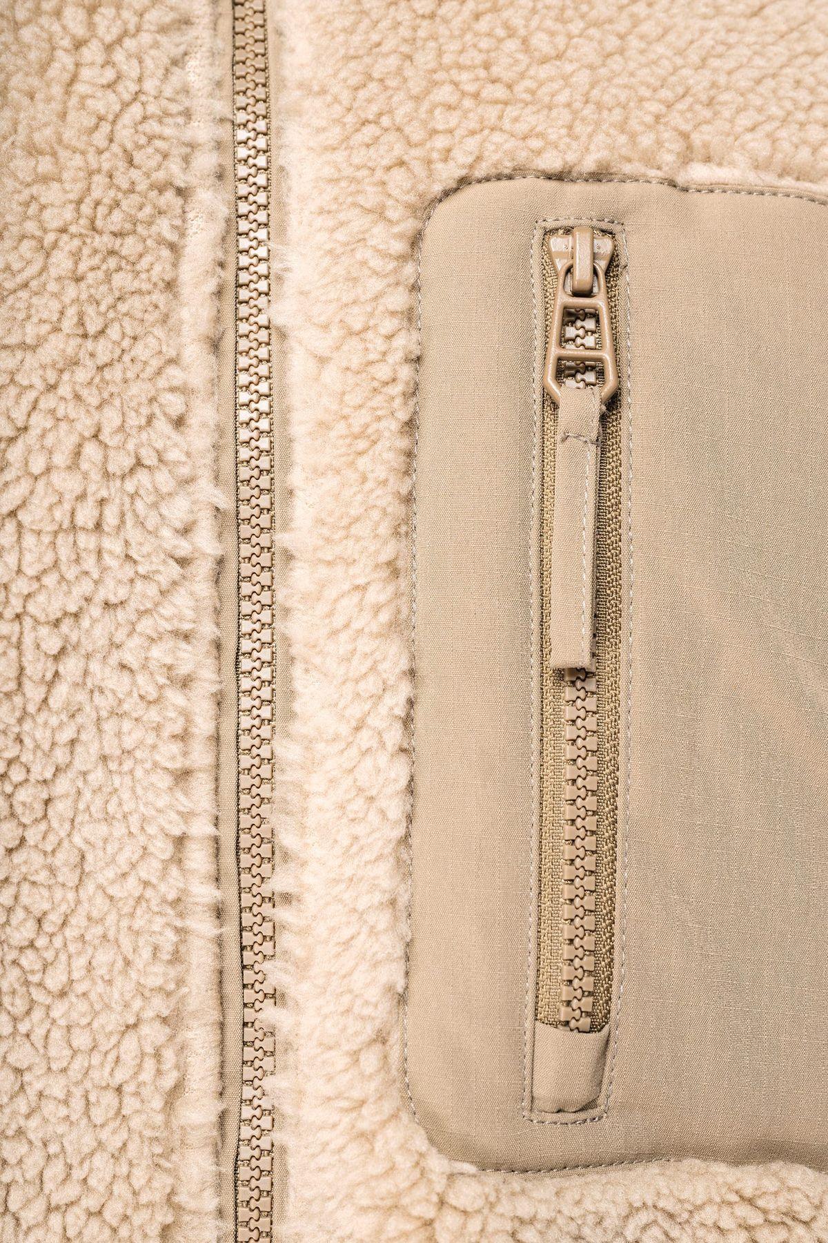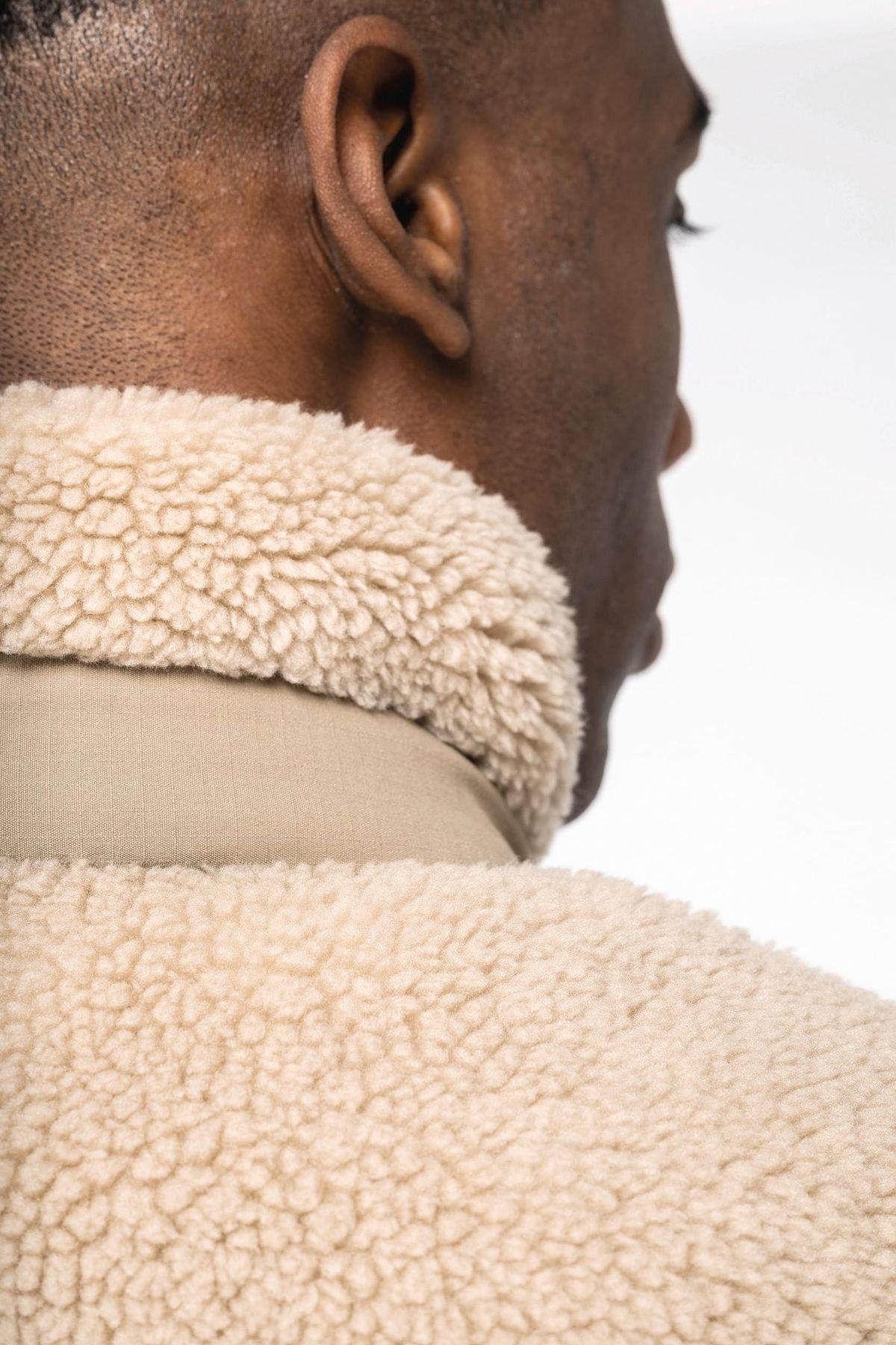 100% polyester recyclé post-consumer. Matière sherpa double face avec polaire intérieure ton sur ton. Poche poitrine côté cœur et poche passepoilée devant. Empiècement de col et patte de propreté. Zip en matière ripstop contrasté sur la couleur Wet Sand/Driftwood et ton sur ton sur Black. Zip en plastique recyclé milieu devant et poche poitrine, avec tirette en matière principale et curseur en métal. Patte de finition intérieure milieu devant. Bas de manches et de vêtement avec élastique invisible. Intérieur de col en matière sherpa et bride de suspension milieu dos.